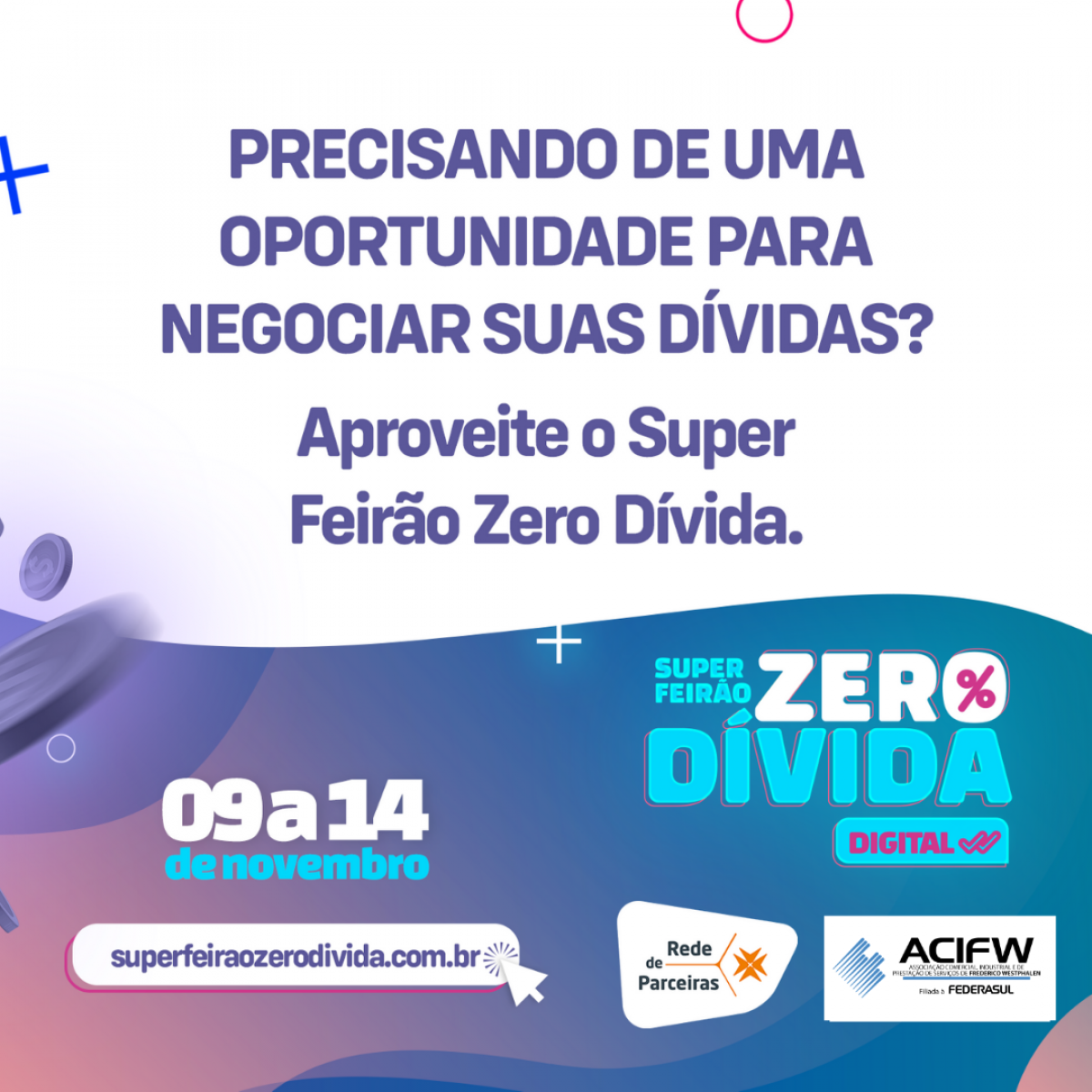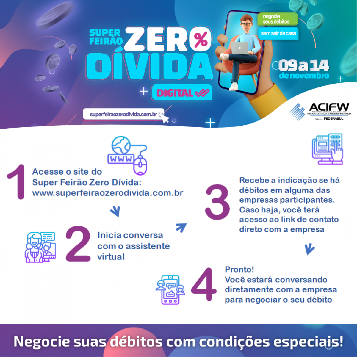 A ACIFW, em parceria com a CDL Poa, está lançando o Super Feirão Zero Dívida, ação que permite a negociação com condições especiais entre empresas e consumidores inadimplentes, oportunizando que estes comecem um ano novo com tudo em dia.