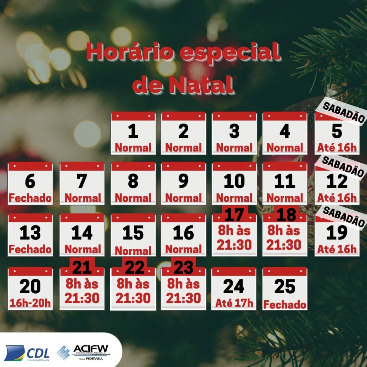 Nos dias 17, 18, 21, 22 e 23 de dezembro o comércio ficará aberto das 8h às 21h30min. Nos dias 5, 12 e 19 de dezembro também ocorrerá o Sabadão dos Negócios, com o funcionamento das lojas a partir das 8h até às 12h e das 13h30min às 16 horas (deverá ser observado os intervalos previstos em lei).