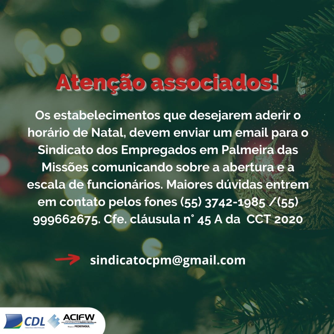 Os estabelecimentos que desejarem abrir no domingo, 20, devem obrigatoriamente se comprometer a protocolar, até o dia 16/12/2020, os acordos de compensação de horários de trabalho e enviar por e-mail ao Sindicato dos Empregados em Palmeira das Missões (sindicatocpm@gmail.com). Aqueles que não realizarem o protocolo de compensação, deverão obrigatoriamente pagar horas extras aos seus empregados com acréscimo de 100% sobre a hora normal na folha de pagamento do mês de dezembro de 2020. Além disso, somente as empresas que protocolarem o acordo com a entidade Sindical Profissional poderão utilizar da mão de obra emprega no domingo, sendo que essas horas devem ser pagas com o adicional de 100% sobre cada hora trabalhada. O horário de funcionamento será, nesse dia, das 16h às 20h. Já na véspera de natal, 24, as lojas ficarão abertas até às 17h.