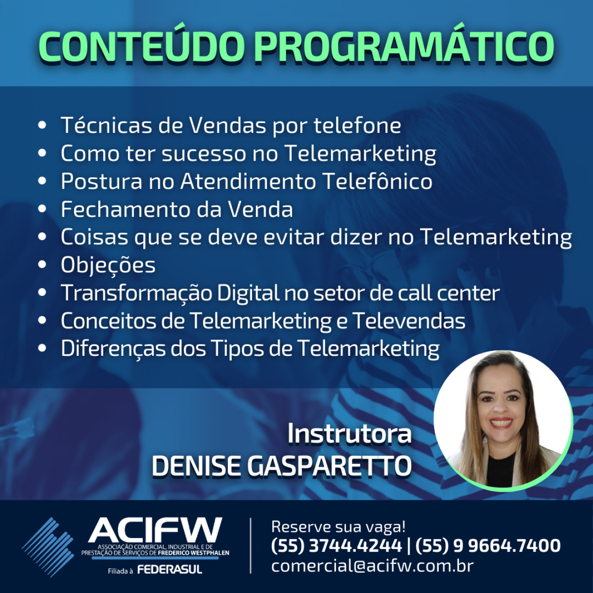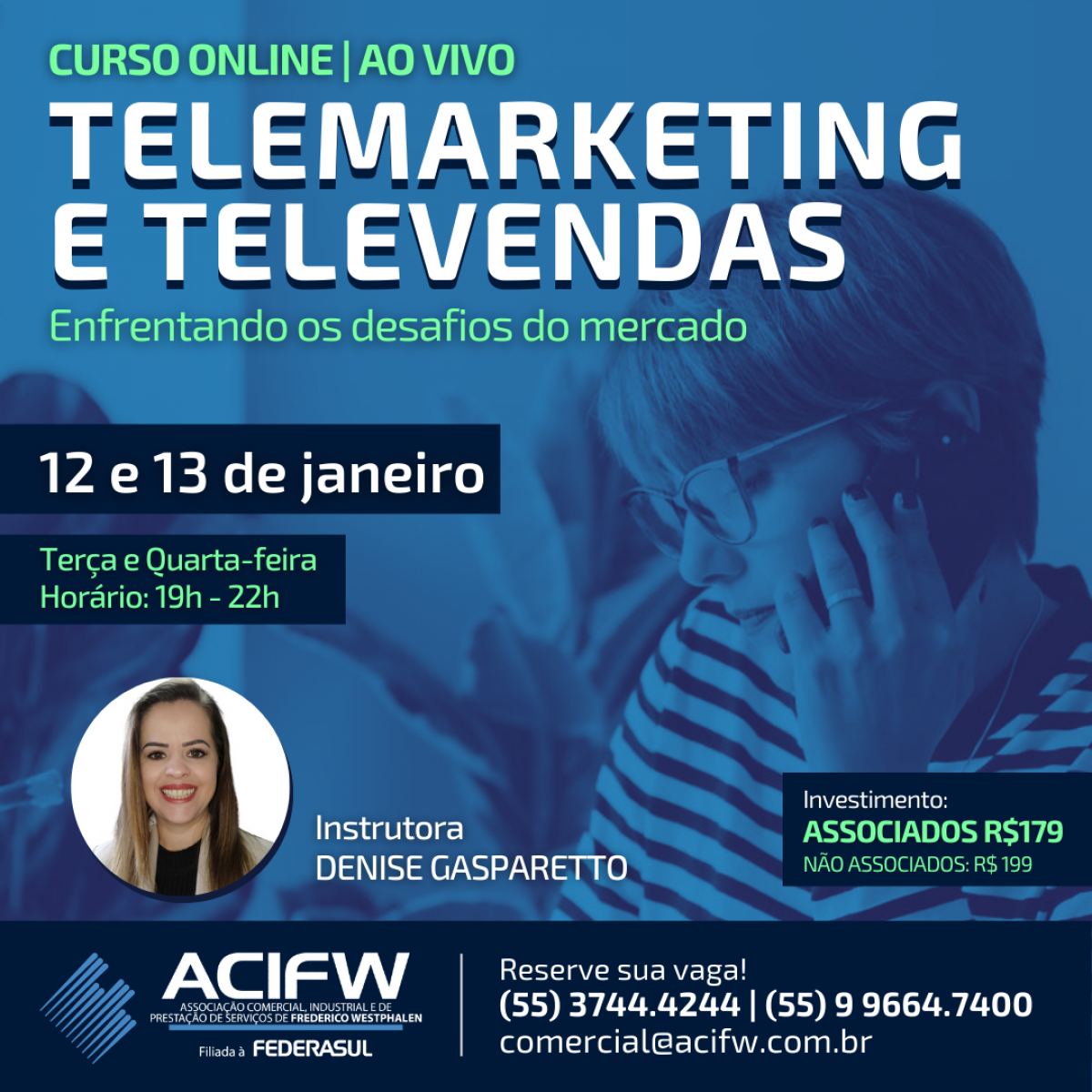 A prova disso é que muitas empresas possuem canal de televendas ou dinâmicas já consolidadas devido muitos consumidores se sentirem seguros comprando ao falar diretamente com uma pessoa, sendo um canal importante não só para vendas, mas para o relacionamento com o cliente. Com o objetivo de oferecer uma capacitação específica para a área, a ACIFW irá promover um curso em formato online e ao vivo na próxima semana, dias 12 e 13 de janeiro, das 19h às 22h.