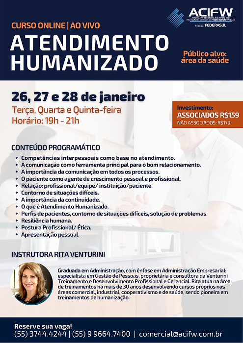 Oferecer um atendimento humanizado é tão importante quanto investir em tecnologia e sistemas de gestão de atendimento, mostrando-se um verdadeiro diferencial na equipe. Assim, com o objetivo de oferecer uma capacitação específica para a área da saúde, a ACIFW irá promover um curso em formato online e ao vivo nos dias 26, 27 e 28 de janeiro, das 19h às 21h.