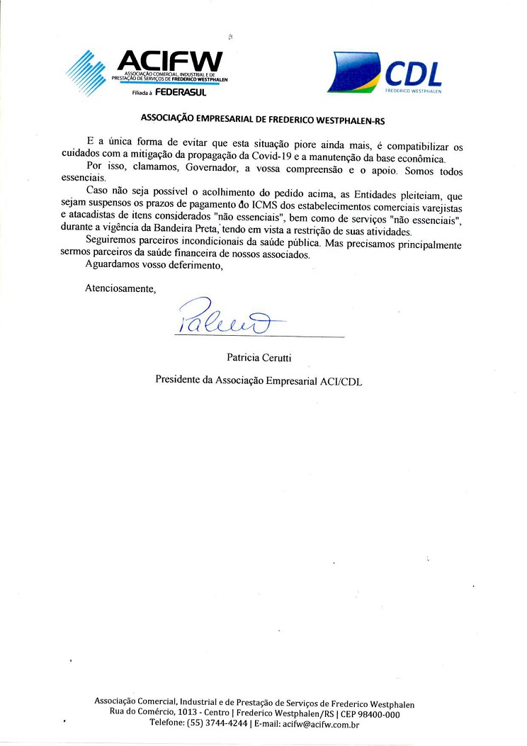 A FCDL-RS, à qual a CDL-FW é filiada, também está mobilizando as entidades. A Associação Empresarial de Frederico Westphalen ACI/CDL, então, encaminhou nesta tarde uma carta de apelo ao Governador pedindo para que os critérios da bandeira preta sejam abrandados, possibilitando que o setor do Comércio possa trabalhar com 25% de trabalhadores, com atendimento presencial restrito e individualizado aos clientes, respeitando 8m² de área útil de circulação e seguindo rigidamente os protocolos sanitários. Em caso de não acolhimento, as entidades também pleiteiam a suspensão dos prazos de pagamento do ICMS durante a vigência da bandeira preta. A carta da Associação Empresarial também está disponível abaixo.