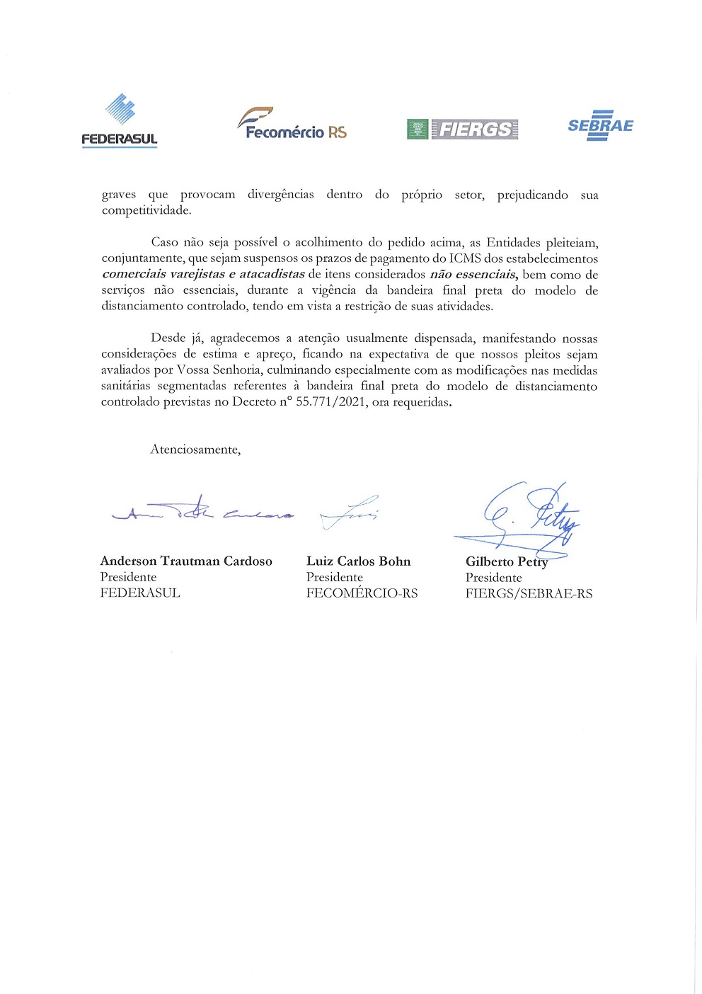 A Federasul, à qual a ACIFW é filiada, em conjunto com a Fecomércio-RS e o Sebrae-RS, protocolaram uma carta ao Governador do RS Eduardo Leite pleiteando modificações nas medidas sanitárias segmentadas referentes à bandeira final preta do modelo de distanciamento controlado. O documento pede aperfeiçoamentos em relação ao comércio varejista e atacadista não essenciais, ou a suspensão dos prazos de pagamento do ICMS destes estabelecimentos. Confira a carta na íntegra.