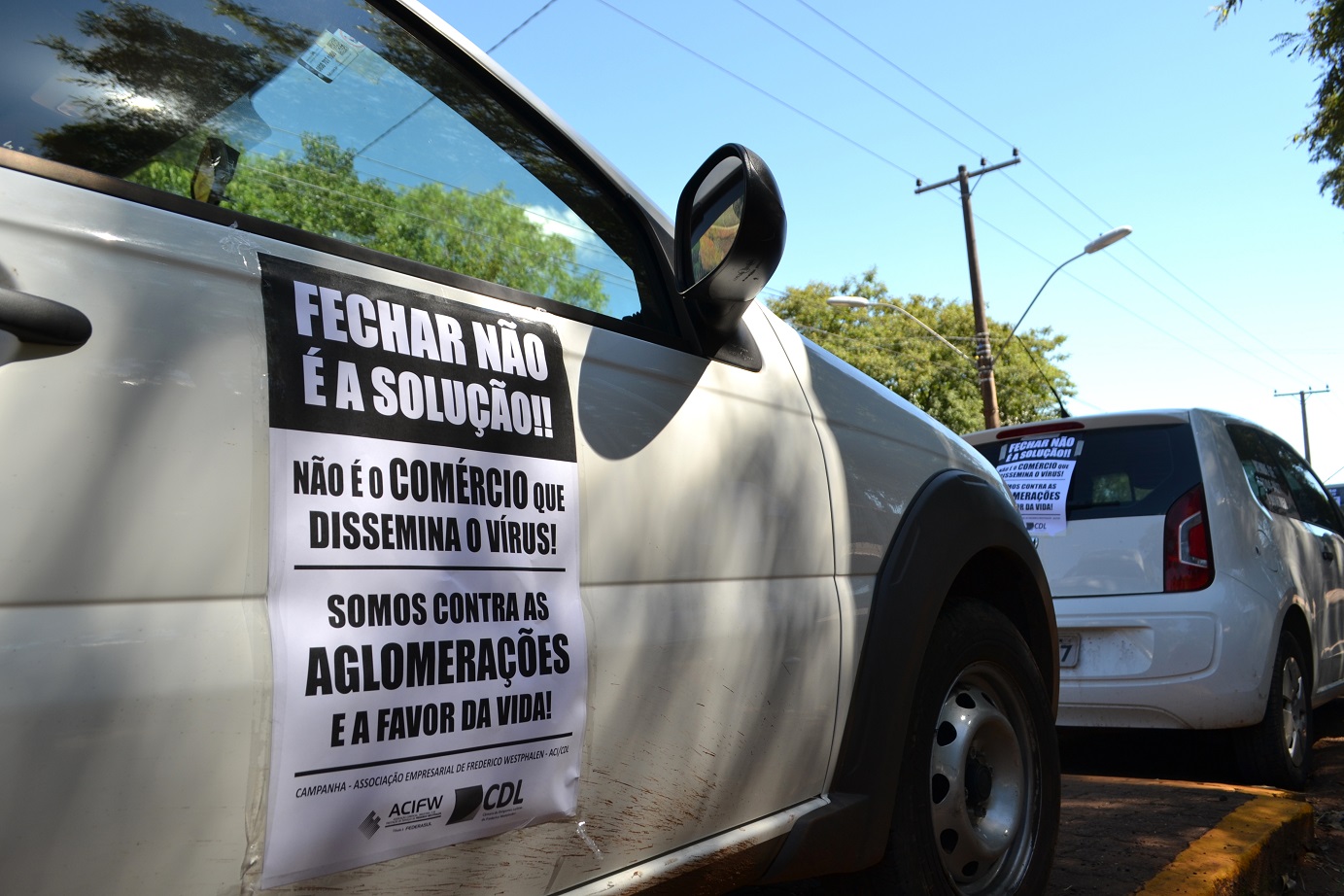 Em Frederico Westphalen, a ação foi organizada pela Associação Empresarial ACI/CDL com a carreata formada por veículos de cerca de 200 empresas locais, que percorreram as ruas com dois carros de som, balões pretos e cartazes com a seguinte mensagem: “Fechar não é a solução. Não é o comércio que dissemina o vírus! Somos contra as aglomerações e a favor da vida!”.