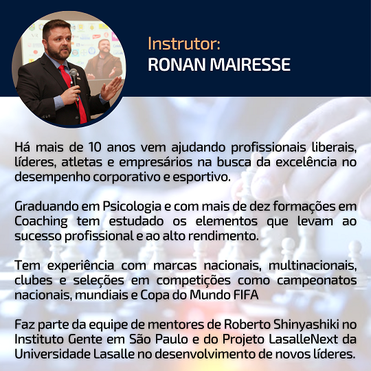 Há mais de 10 anos, Ronan Mairesse vem ajudando profissionais liberais, líderes, atletas e empresários na busca da excelência no desempenho corporativo e esportivo. Graduando em Psicologia e com mais de dez formações em Coaching, tem estudado os elementos que levam ao sucesso profissional e ao alto rendimento. Tem experiência com marcas nacionais, multinacionais, clubes e seleções em competições como campeonatos nacionais, mundiais e Copa do Mundo FIFA. Faz parte da equipe de mentores de Roberto Shinyashiki no Instituto Gente em São Paulo e do Projeto LasalleNext da Universidade Lasalle no desenvolvimento de novos líderes.