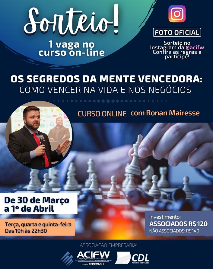A ACIFW está realizando o sorteio de uma vaga para o curso através do Instagram da entidade: @acifw. As regras para participar estão explicadas na “Foto Oficial” no Instagram.