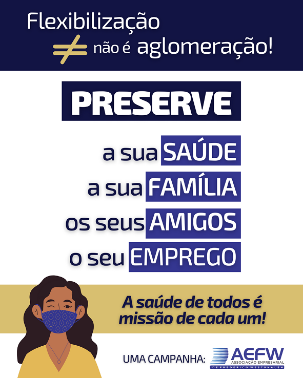 No encontro online, foi apresentada a campanha “Flexibilização não é aglomeração”, que está sendo divulgada entre as mais de 550 empresas associadas para utilizarem na sensibilização das suas equipes. A presidente da AEFW, Patricia Cerutti, destacou que “sabemos que não é no horário de expediente que as contaminações acontecem, pois em nossas empresas procuramos seguir todas as recomendações sanitárias, mas sim nas reuniões familiares e entre amigos, fora do horário de trabalho, quando normalmente relaxamos e não usamos as EPIs obrigatórias em nossas empresas. Por isso, precisamos alertar nossas equipes de que, se não ajudarmos a reduzir os números de contaminações, em breve enfrentaremos um novo período de limitações mais severas”.