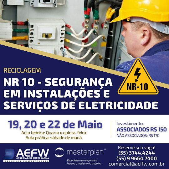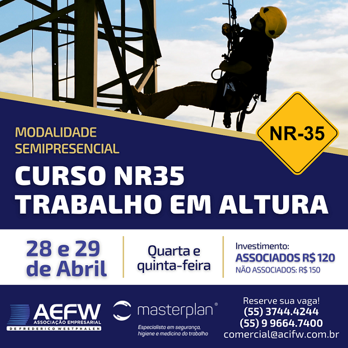 Com o objetivo de conscientizar a comunidade e dar mais visibilidade ao tema, a Associação Empresarial ACI/CDL de Frederico Westphalen (AEFW), em parceria com a empresa Masterplan, irá promover dois cursos na área de segurança do trabalho: NR35 – Trabalho em altura e Reciclagem para NR10 - Segurança em Instalações e Serviços em Eletricidade. Os treinamentos são obrigatórios e as empresas associadas da AEFW contam com desconto especial nas vagas. As inscrições já estão abertas e podem ser realizadas pelo telefone (55) 3744-4244, Whatsapp (55) 99664-7400 ou no e-mail: comercial@acifw.com.br.