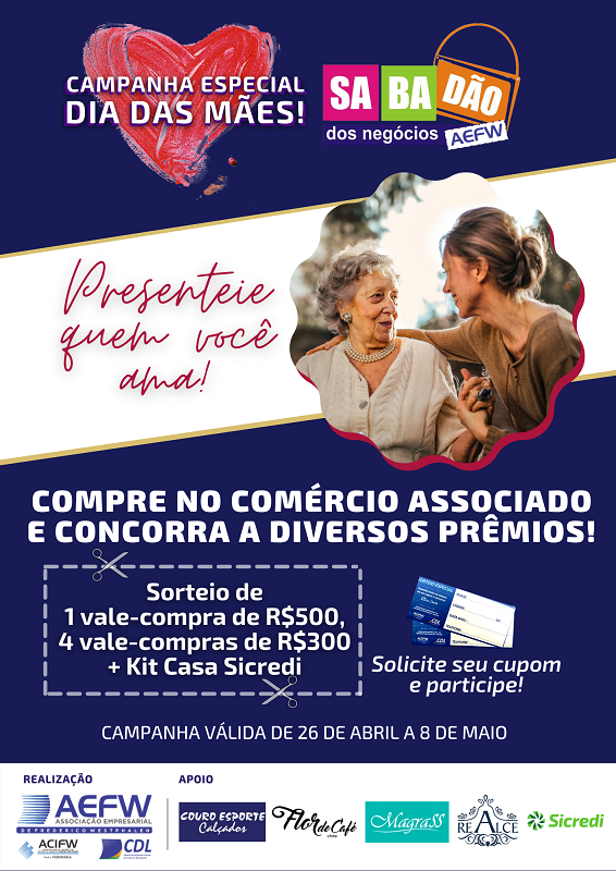 Mais uma edição do Sabadão dos Negócios será realizada pela Associação Empresarial ACI/CDL de Frederico Westphalen (AEFW), agora em comemoração ao Dia das Mães. A campanha iniciará na segunda, dia 26 de abril, e se estenderá até o dia 8 de maio, data do Sabadão. Durante o período, as empresas participantes associadas da AEFW irão distribuir cupons aos clientes para concorrerem a 6 prêmios, entre vale-compras e presentes, com sorteio no dia 13 de maio.