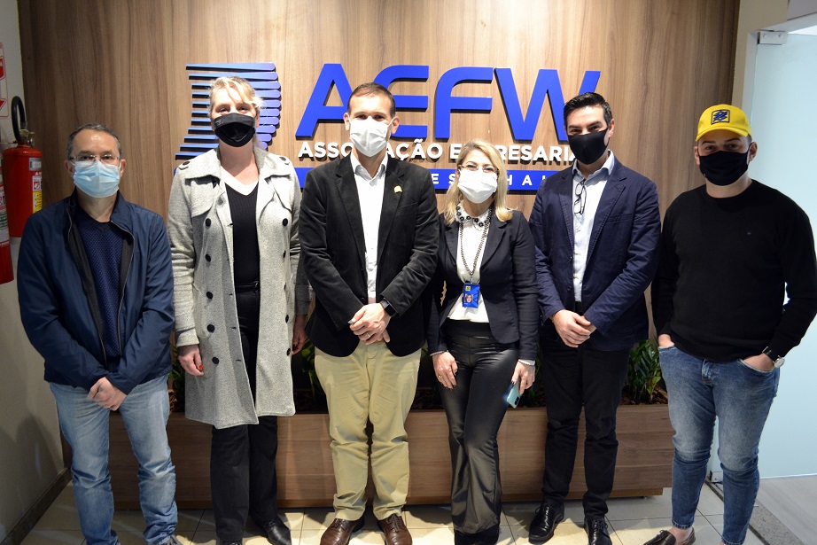 No último dia 15, a diretoria da AEFW recebeu a visita do Superintendente Regional do Banco do Brasil, Anderson Franco, acompanhado da Gerente Geral da Agência FW, Irádi Lima, e do Gerente de Empresas da Agência FW, Elizandro Pillon. Na reunião, o grupo comentou sobre o crescimento do fomento que a agência local está proporcionando aos negócios locais, especialmente para o setor do agronegócio, e a respeito das linhas de crédito que estão disponíveis para os associados da entidade, como o Pronampe.