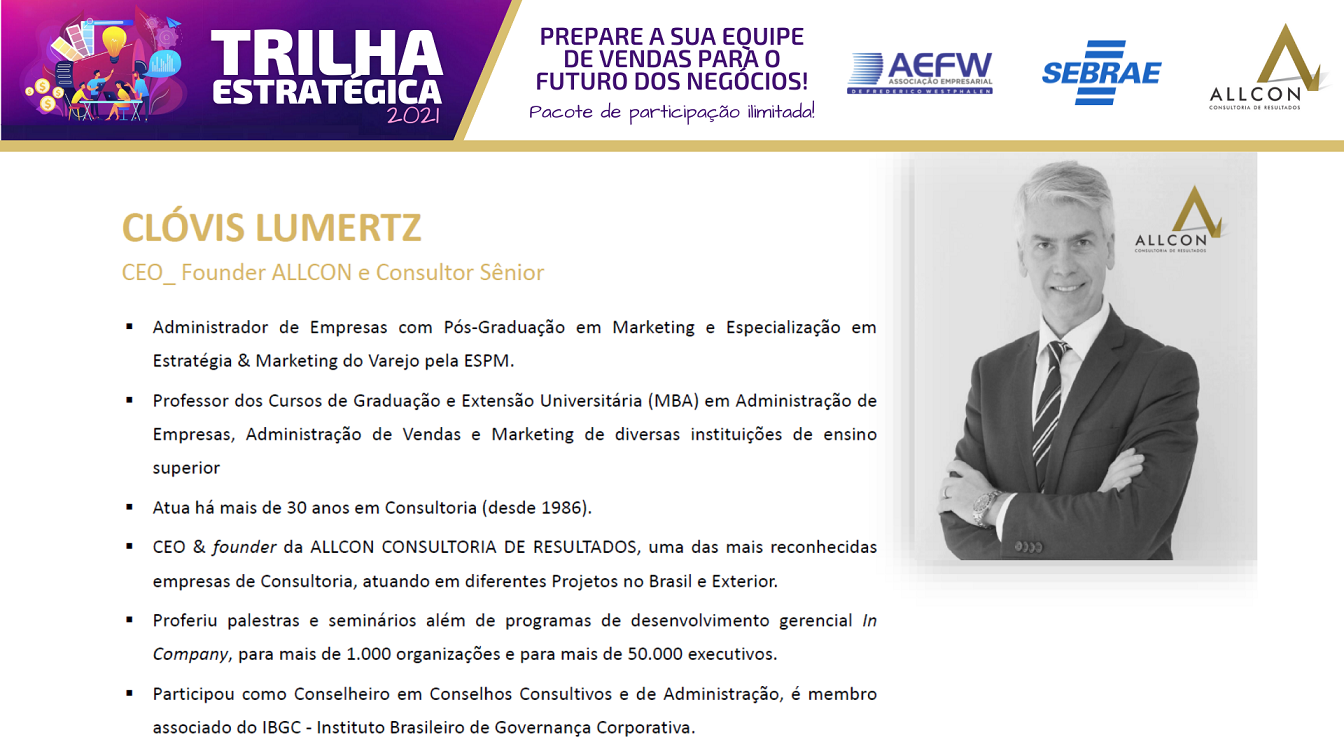 Clóvis é administrador de empresas com pós-graduação em Marketing e Especialização em Estratégia & Marketing do Varejo (ESPM). Professor dos cursos de graduação e extensão universitária (MBA) em Administração de Empresas, Administração de Vendas e Marketing de diversas instituições de ensino superior, além de atuar há mais de 30 anos em consultoria empresarial. Também, é CEO& founder da Allcon Consultoria de Resultados, uma das mais reconhecidas empresas de consultoria, atuando em diferentes projetos no Brasil e exterior. Proferiu palestras e seminários, além de programas de desenvolvimento gerencial in company para mais de 1 mil organizações, contemplando mais de 50 mil executivos. Participou como Conselheiro em conselhos consultivos e de administra e é membro associado do Instituto Brasileiro de Governança Corporativa – IBGC.