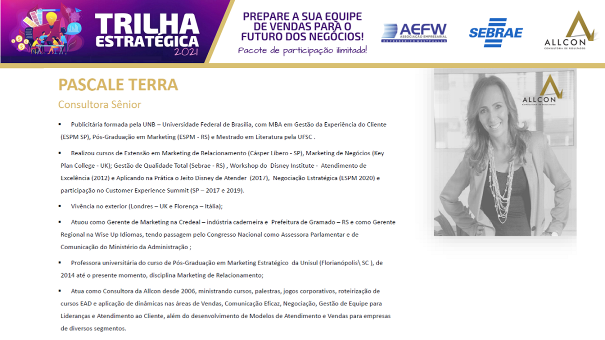 Pascale é Publicitária (Universidade Federal de Brasília – UNB), com MBA em Gestão da Experiência do Cliente (ESPM-SP), pós-graduação em Marketing (ESPM-RS) e mestrado em Literatura (UFSC). Realizou cursos de extensão em Marketing de Relacionamento (Cásper Líbero – SP), Marketing de Negócios (Key Plan College – UK), Gestão de Qualidade Total (Sebrae-RS), Workshop do Disney Institute: “Atendimento de Excelência” e “Aplicando na Prática o Jeito Disney de Atender”, Negociação Estratégica (ESPM 2020) e participação em edições do Costumer Experience Summit. Atuou como Gerente de Marketing na Credeal e Prefeitura de Gramado, tendo passagem pelo Congresso Nacional como Assessora Parlamentar e de Comunicação do Ministério da Administração. Ainda, Pascale atua como professora universitária do curso de pós-graduação em Marketing Estratégico da Unisul (Florianópolis-SC) e como consultora da Allcon desde 2006, ministrando cursos, palestras, jogos corporativos, desenvolvimento de modelos de atendimento, dentre outras atividades.