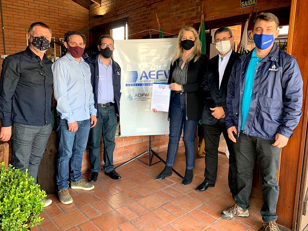 Apresidente da AEFW, Patricia Cerutti, estava acompanhada do presidente da Expofred, Marcos Antonio Lima; do secretário municipal de Indústria, Comércio e Turismo, Alessandro Molossi; e da diretora estadual da Federasul e ex-presidente da ACIFW, Simonia Gonçalves de Oliveira.