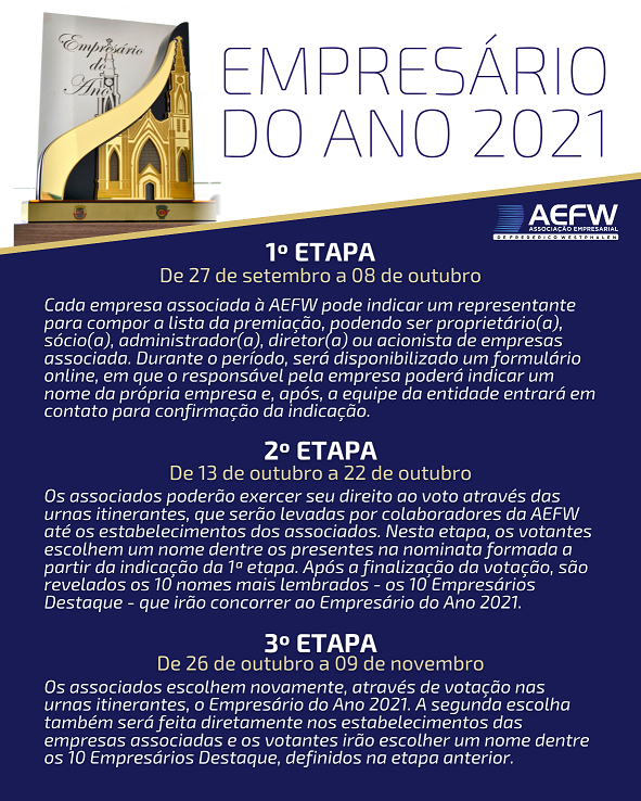 Os associados poderão exercer seu direito ao voto através das urnas itinerantes, que serão levadas por colaboradores da AEFW até os estabelecimentos dos associados. Nesta etapa, os votantes escolhem um nome dentre os presentes na nominata formada a partir da indicação da 1ª etapa. Após a finalização da votação, são revelados os 10 nomes mais lembrados - os 10 Empresários Destaque - que irão concorrer ao Empresário do Ano 2021.