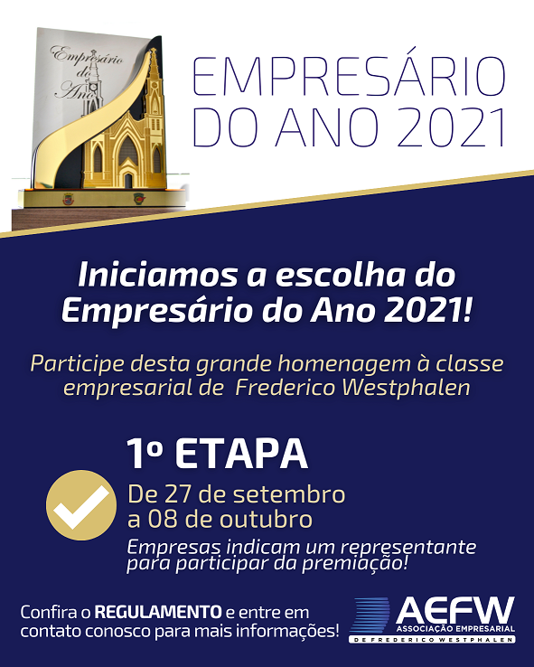 A primeira etapa da escolha do Empresário do Ano 2021, promovida pela Associação Empresarial ACI/CDL de Frederico Westphalen (AEFW), acontece até o dia 08 de outubro. A tradicional premiação tem o objetivo de homenagear os profissionais que se destacam na comunidade pelo desempenho empresarial, por ações de liderança e participação comunitária e que, pelo seu exemplo, contribuam para estimular e elevar o desenvolvimento e a representatividade da classe empresarial de Frederico Westphalen. Os 10 empresários(as) mais lembrados(as) durante a 2ª etapa são homenageados como Empresários Destaque e recebem o Troféu AEFW e, dentre eles, é escolhido o Empresário do Ano 2021, que recebe o Troféu Catedral.
