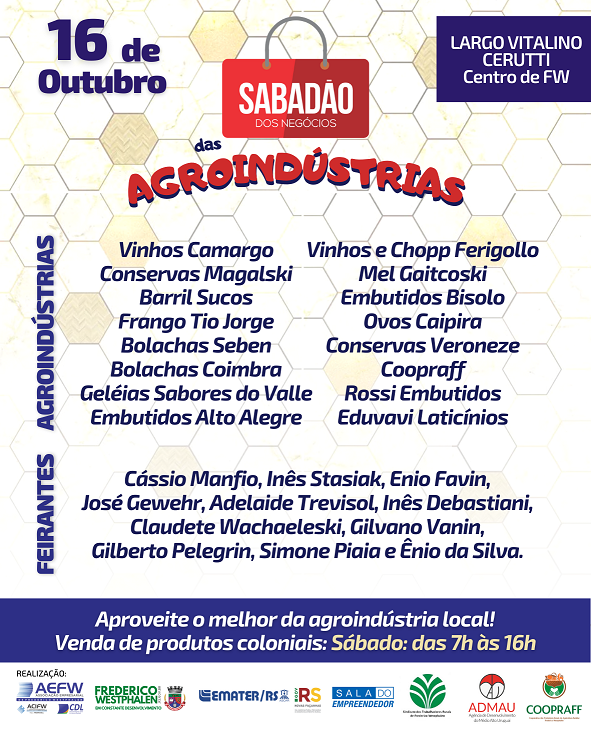 A Associação Empresarial ACI/CDL de Frederico Westphalen (AEFW) promove, tradicionalmente, o Sabadão dos Negócios no segundo sábado de cada mês e no próximo sábado, dia 16, realizará um evento especial: o “Sabadão dos Negócios das Agroindústrias”, no Largo Vitalino Cerutti, no centro de FW. Esta edição especial está sendo realizada pela AEFW em conjunto com a Prefeitura de FW, Emater/RS-Ascar, Sala do Empreendedor, Sindicato dos Trabalhadores Rurais de FW, ADMAU, COOPRAFF.