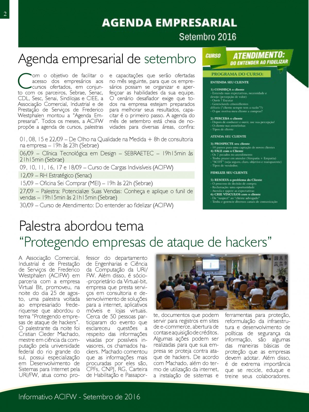 A Associação Comercial, Industrial e de Prestação de Serviços de Frederico Westphalen (ACIFW) em parceria com a empresa Virtual Bit, promoveu, na noite do dia 25 de agosto, uma palestra voltada ao empresariado frederiquense que abordou o tema “Protegendo empresas de ataque de hackers”. O palestrante da noite foi Cristian Cleder Machado, mestre em ciência da computação pela universidade federal do rio grande do sul, possui especialização em desenvolvimento de Sistemas para Internet pela URI/FW, atua como professor do departamento de Engenharias e Ciência da Computação da URI/FW. Além disso, é sócio-proprietário da Virtual-bit, empresa que presta serviços em consultoria e desenvolvimento de soluções para a internet, aplicativos móveis e lojas virtuais.