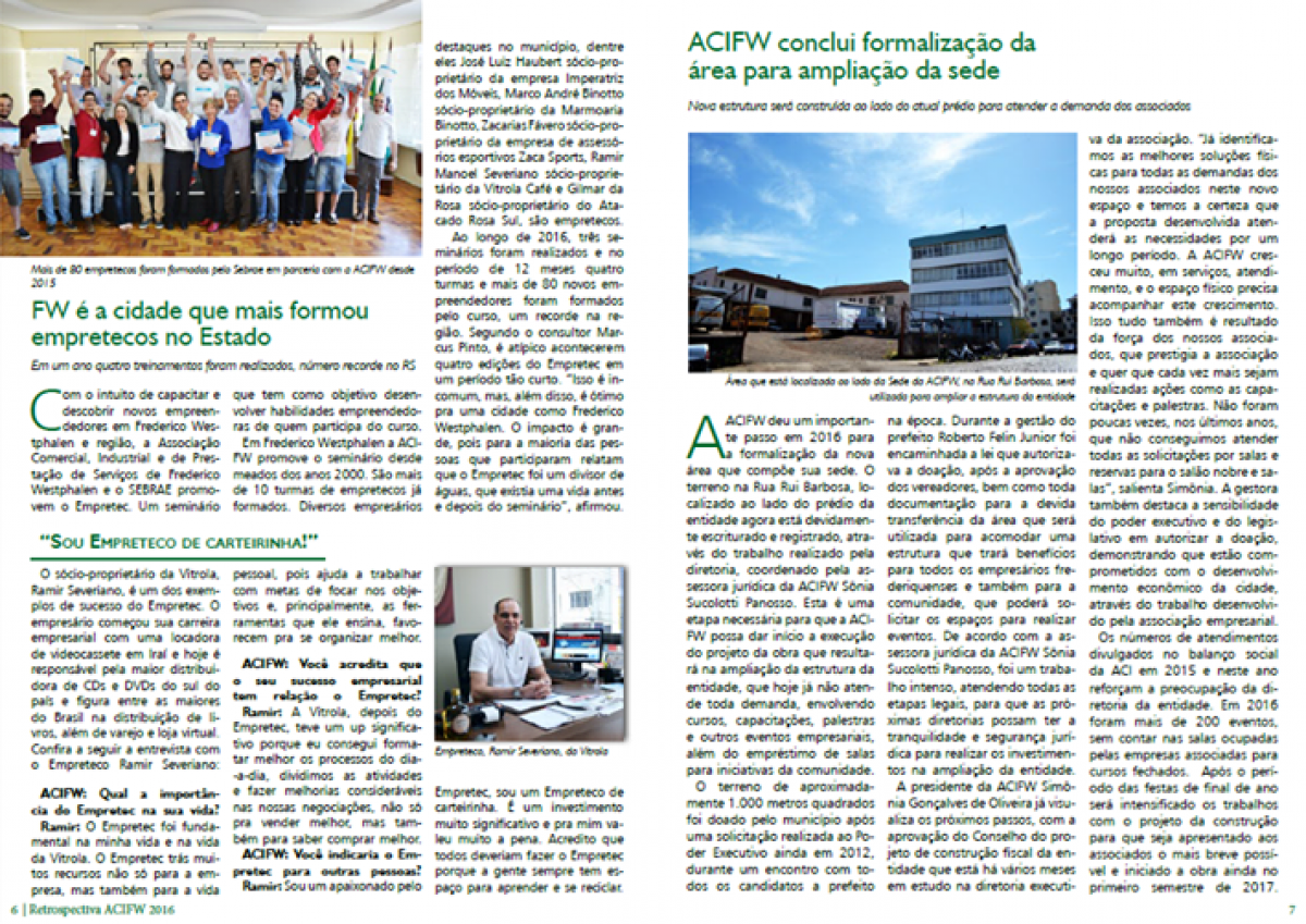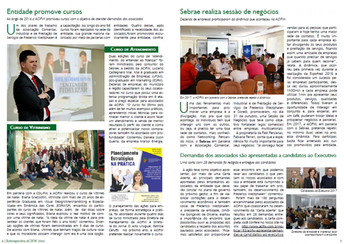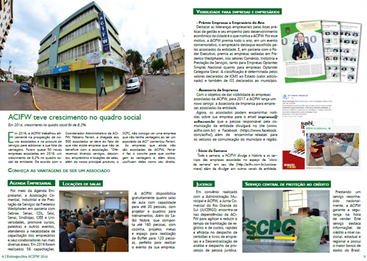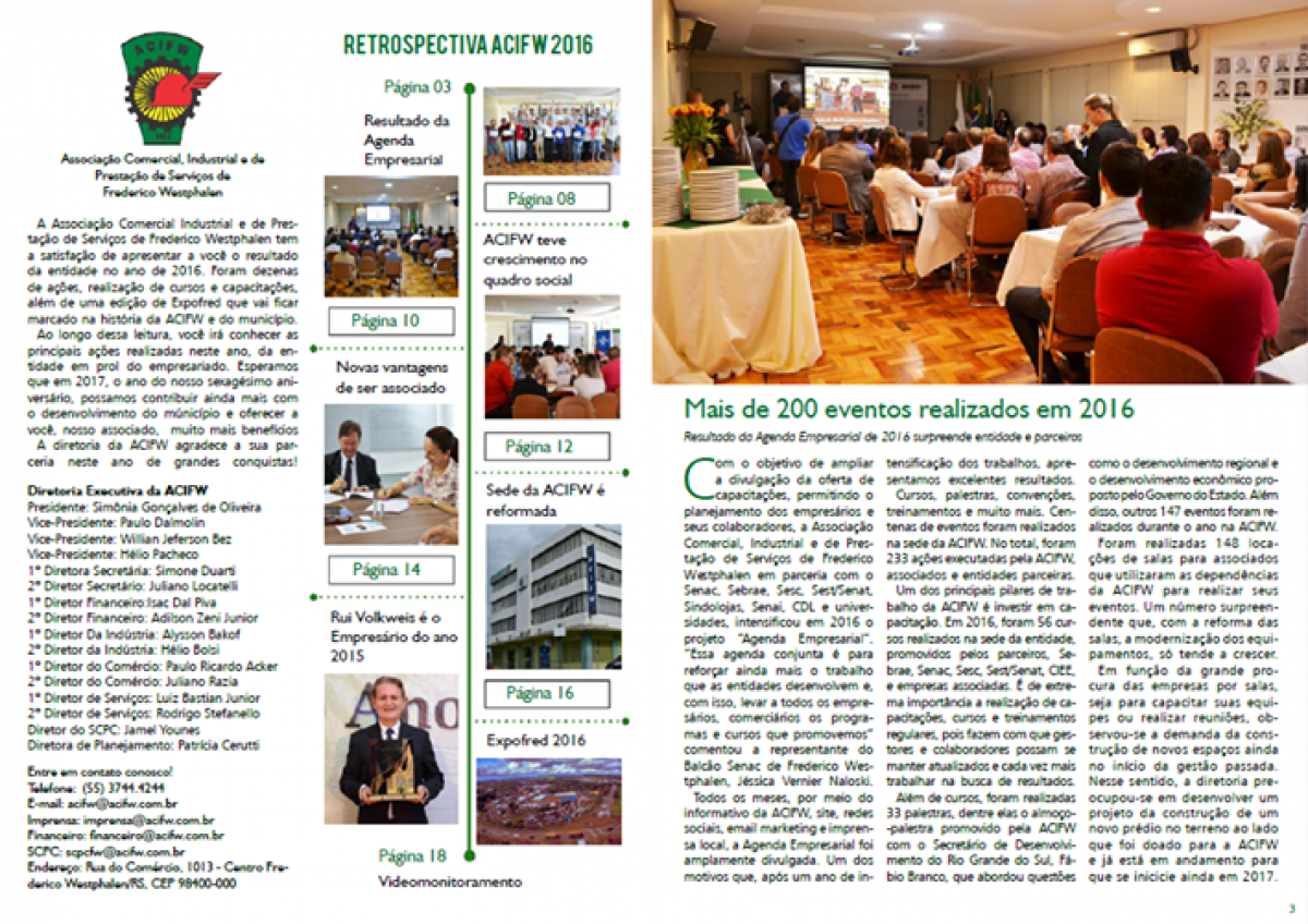 A Associação Comercial, Industrial e de Prestação de Serviços de Frederico Westphalen tem a satisfação de apresentar a você os resultados da entidade no ano de 2016. Foram dezenas de ações, realização de cursos e capacitações, além de uma edição de Expofred que vai ficar marcado na história da ACIFW e do município. No mês de janeiro, disponibilizaremos aos associados à edição impressa da revista de retrospectiva da associação, além disso, será possível visualiza-la no site também. Ao longo dessa leitura, você irá conhecer as principais ações realizadas neste ano, da entidade em prol do empresariado. Esperamos que em 2017, o ano do nosso sexagésimo aniversário, possamos contribuir ainda mais com o desenvolvimento do município e oferecer a você, nosso associado, muito mais benefícios.