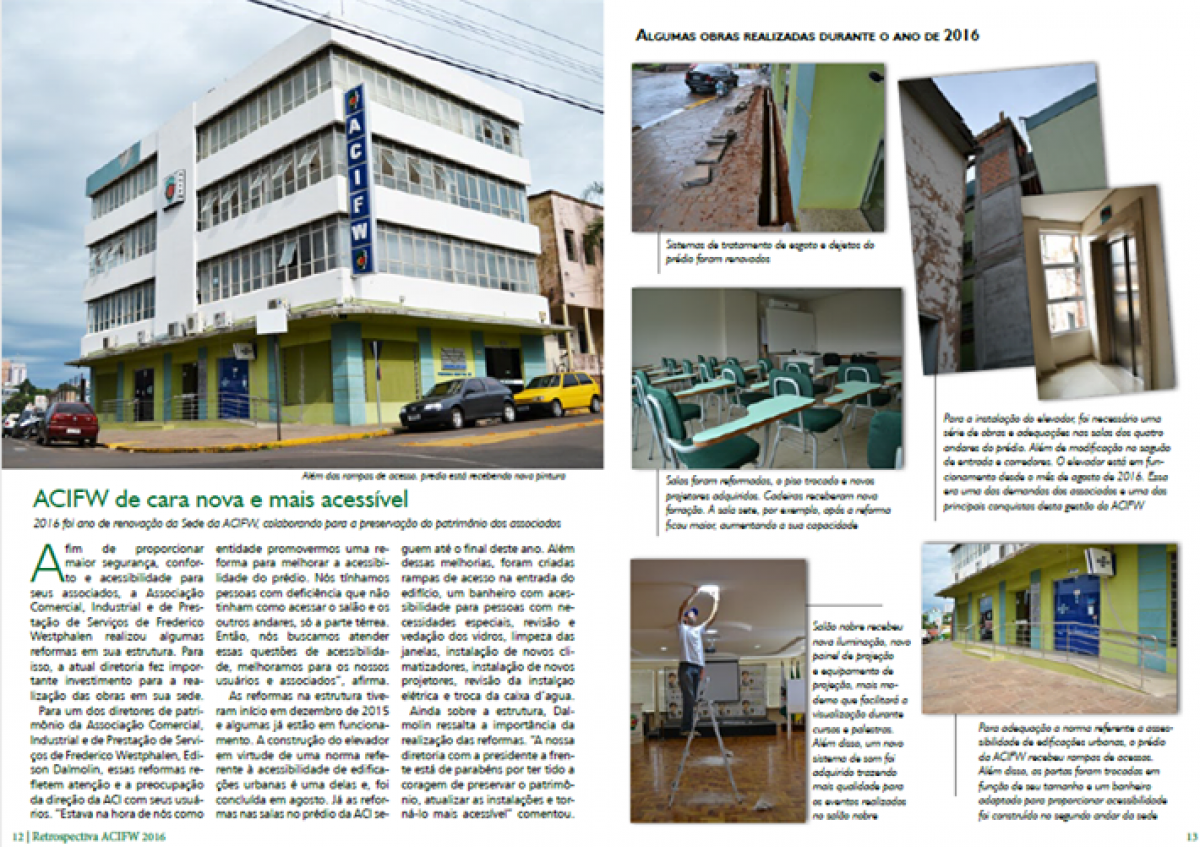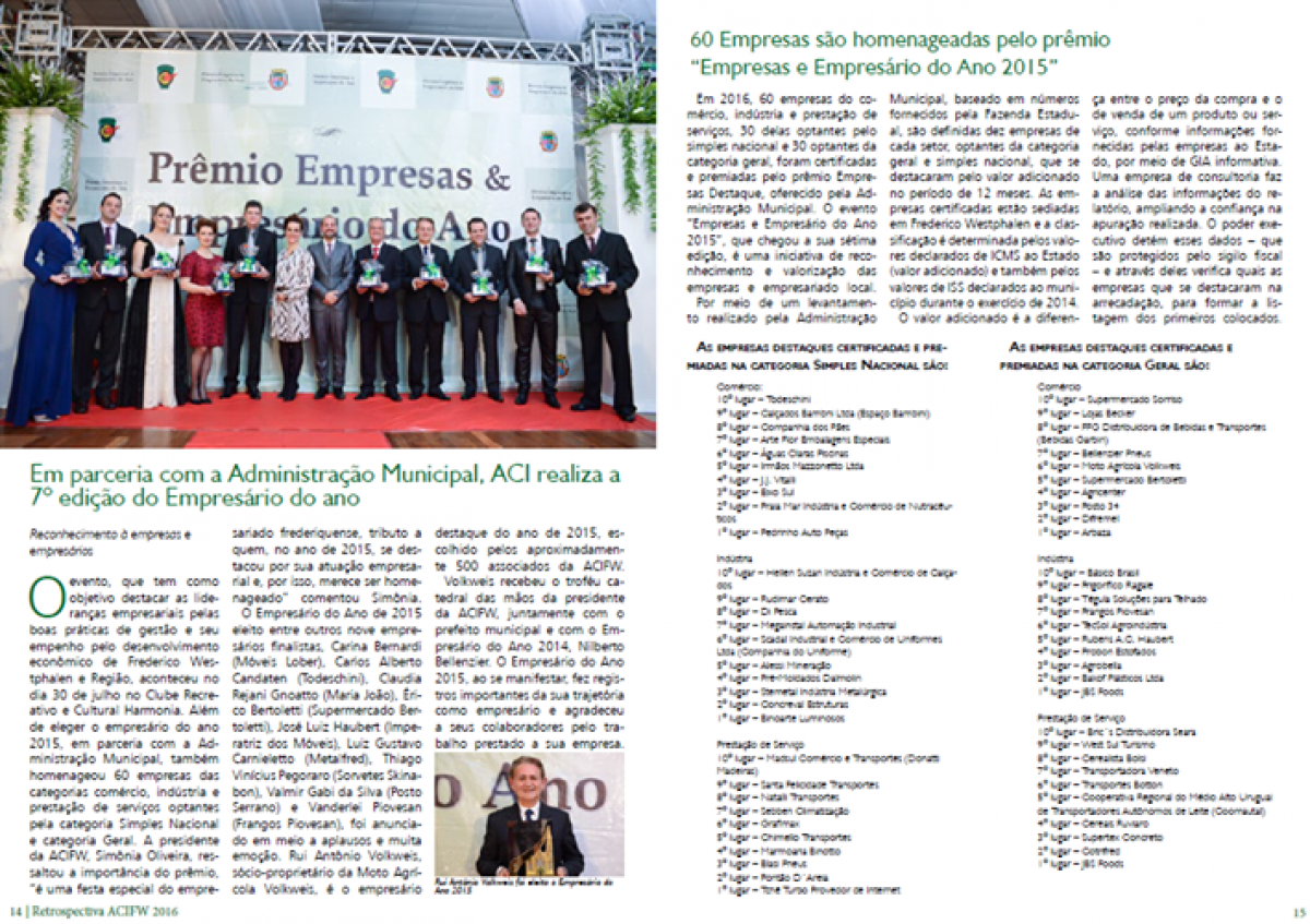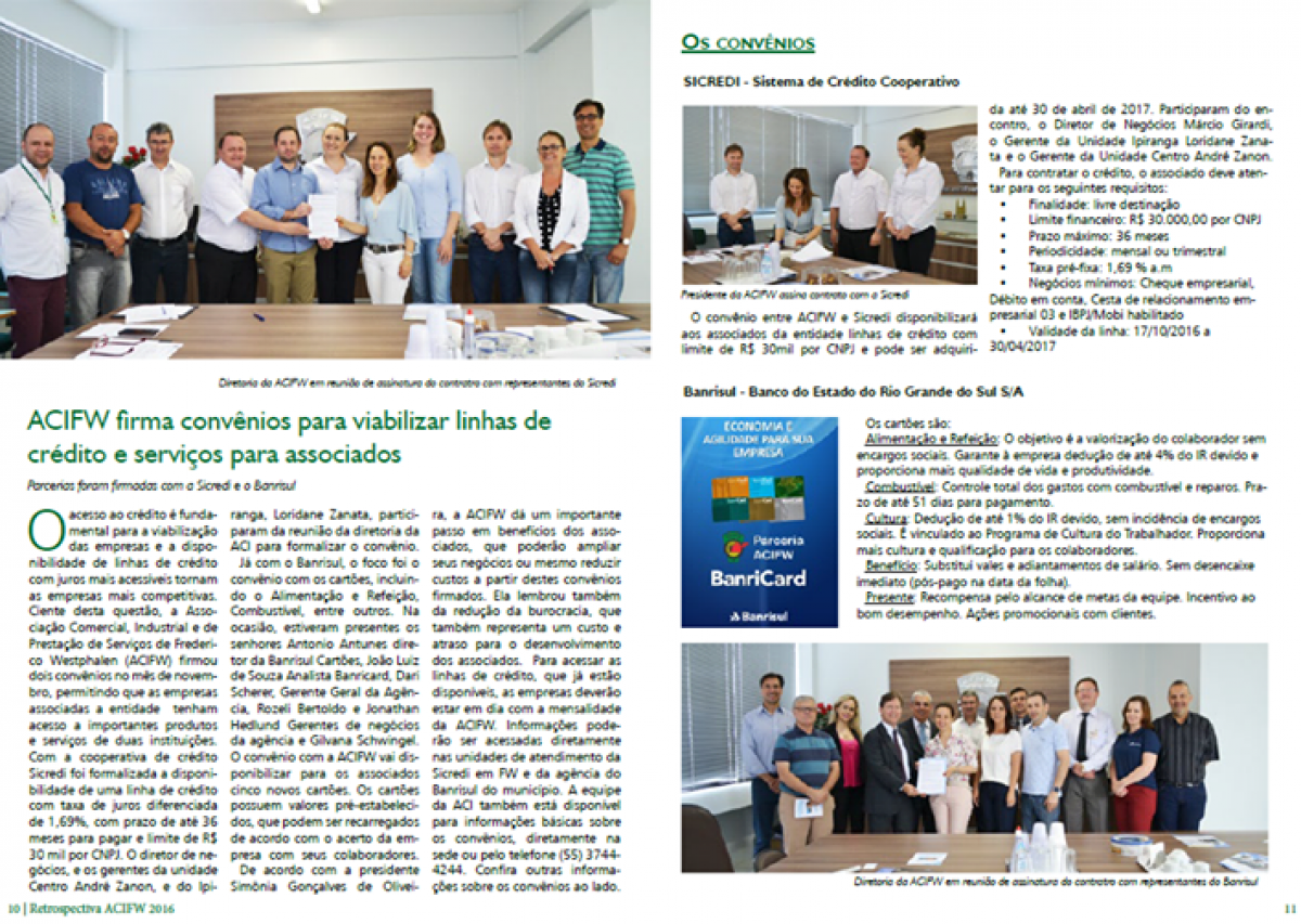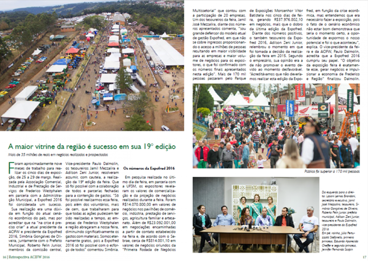 A Associação Comercial, Industrial e de Prestação de Serviços de Frederico Westphalen tem a satisfação de apresentar a você os resultados da entidade no ano de 2016. Foram dezenas de ações, realização de cursos e capacitações, além de uma edição de Expofred que vai ficar marcado na história da ACIFW e do município. No mês de janeiro, disponibilizaremos aos associados à edição impressa da revista de retrospectiva da associação, além disso, será possível visualiza-la no site também. Ao longo dessa leitura, você irá conhecer as principais ações realizadas neste ano, da entidade em prol do empresariado. Esperamos que em 2017, o ano do nosso sexagésimo aniversário, possamos contribuir ainda mais com o desenvolvimento do município e oferecer a você, nosso associado, muito mais benefícios.