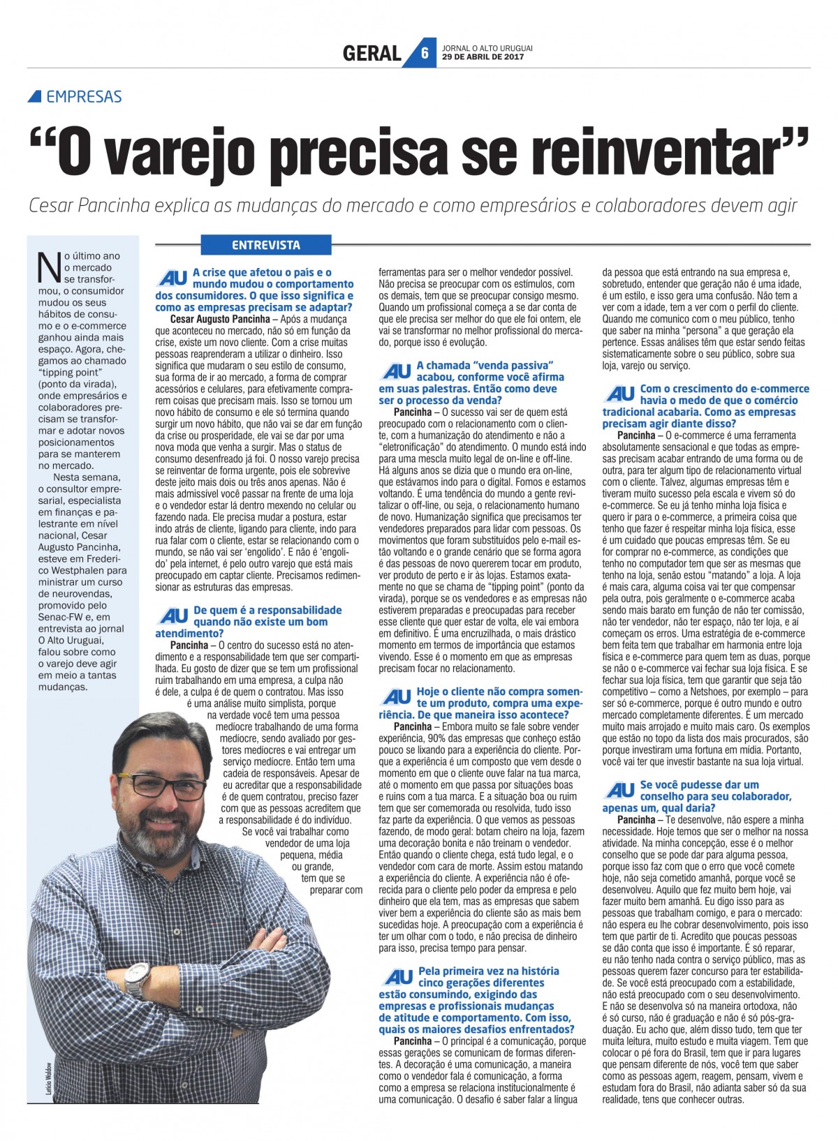 Cesar Augusto Pancinha, que esteve ministrando o Curso de Neurovendasnos dias 25 e 26 de abril, promovido pelo Senac, com apoio da ACIFW, foi entrevistado pelo jornal O Alto Uruguai. O consultor empresarial afirmou que “o nosso varejo precisa se reinventar de forma urgente”. Pancinha também respondeu questões sobre atendimento, processo de venda, desafios enfrentados, e-commerce, além de compartilhar um conselho que sempre dá aos seus colaboradores e que serve para quem está no mercado de trabalho, independente da atividade: “Te desenvolve, não espere a minha necessidade. Hoje temos que ser o melhor na nossa atividade”.