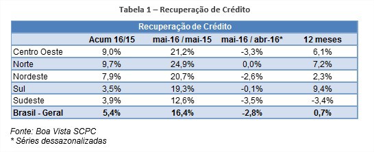 A recuperação de crédito do consumidor – obtida a partir da quantidade de exclusões dos registros de inadimplentes – cresceu 5,4% no acumulado do ano (até maio de 2016), em comparação com o mesmo período do ano anterior, de acordo com dados nacionais da Boa Vista SCPC. Também houve elevação de 0,7% na variação acumulada em 12 meses (período que abrange junho de 2015 até maio de 2016 contra os 12 meses antecedentes), e na avaliação mensal (maio/16 contra maio/15) a elevação foi de 16,4%. Já na análise mensal da série de dados ajustada sazonalmente (maio/16 contra abril/16) houve queda de 2,8% na recuperação de crédito do consumidor.