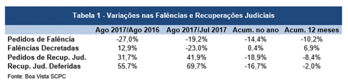 Os pedidos de falência caíram 27,0% na variação de agosto contra o mesmo mês do ano anterior, segundo dados com abrangência nacional da Boa Vista SCPC (Serviço Central de Proteção ao Crédito). Mantida a base de comparação, as falências decretadas subiram 12,9%, enquanto para os pedidos de recuperação judicial e recuperações judiciais deferidas¹ foram observadas altas de 31,7% e 55,7%, respectivamente.