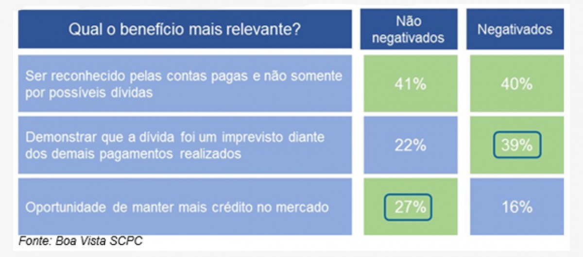 Em pesquisa inédita com consumidores de todo o Brasil, a Boa Vista SCPC identificou que para 46% dos entrevistados, o Cadastro Positivo tem como principal objetivo auxiliar na obtenção de crédito e na contratação de financiamentos. Outros 26% acreditam que o banco de dados com informações positivas sobre consumidores classifica de forma mais assertiva e justa o bom e o mau pagador, e comprova a capacidade de crédito. Já 14% consideram o Cadastro Positivo como um auxílio na organização das contas, regularização dos débitos e a ter o nome limpo, enquanto outros 14% dizem não saber do que se trata ou mesmo que não ajuda financeiramente.