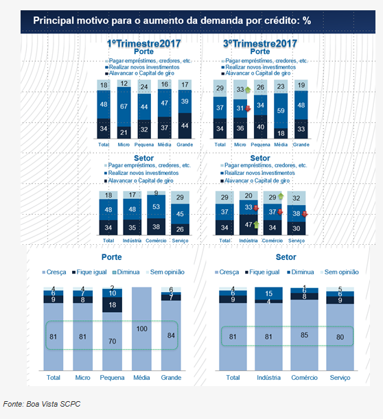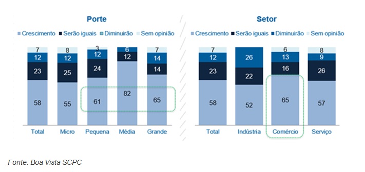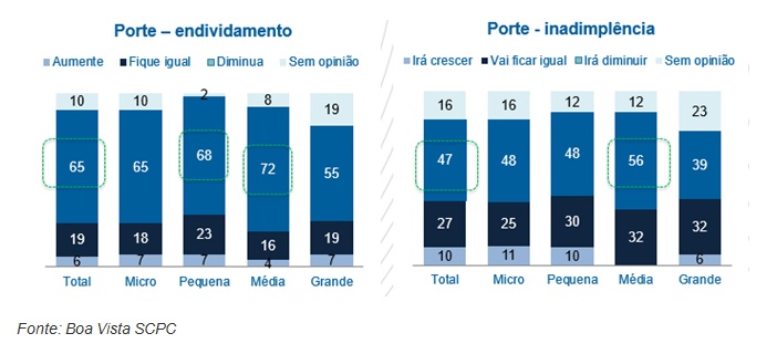 Ainda de acordo com a pesquisa, 65% delas esperam que em 2018 o nível de endividamento diminua em comparação ao ano de 2017. Esta expectativa é maior entre as empresas de pequeno (68%) e médio (72%) portes, e também no setor do comércio (68%). De modo geral, para 2018, 47% das empresas esperam diminuição da inadimplência nos negócios. Entre as empresas de médio porte e também no setor de Comércio, coincidentemente esta expectativa é de 56%, e superior quando comparada aos demais portes e setores analisados.