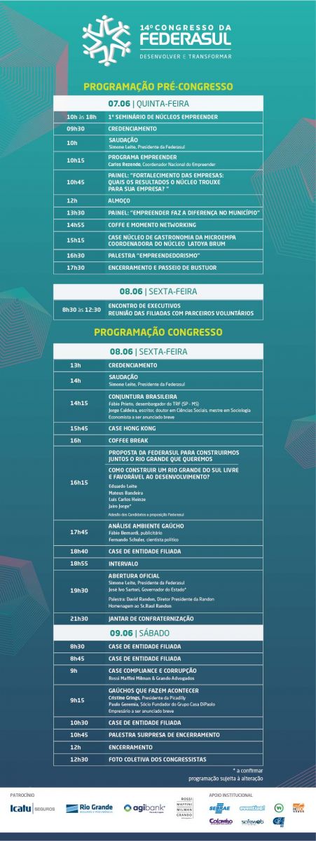 Com o tema “Desenvolver e Transformar”, a Federação de Entidades Empresariais do Rio Grande do Sul (Federasul) programou para os dias 8 e 9 de junho, no Hotel Master Premium, em Gramado, seu 14º Congresso que, tradicionalmente, reúne lideranças do Estado integrados às entidades empresariais do Rio Grande do Sul. Feita sob medida, a pauta do evento conta com mais de 15 atividades para incentivar a reflexão sobre o cenário nacional e discutir alternativas de mudança em prol do futuro do Estado.