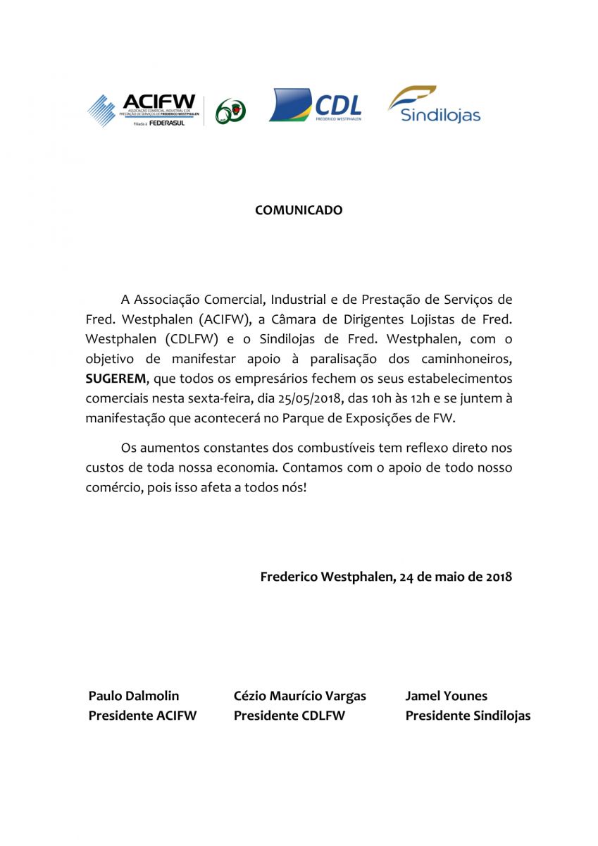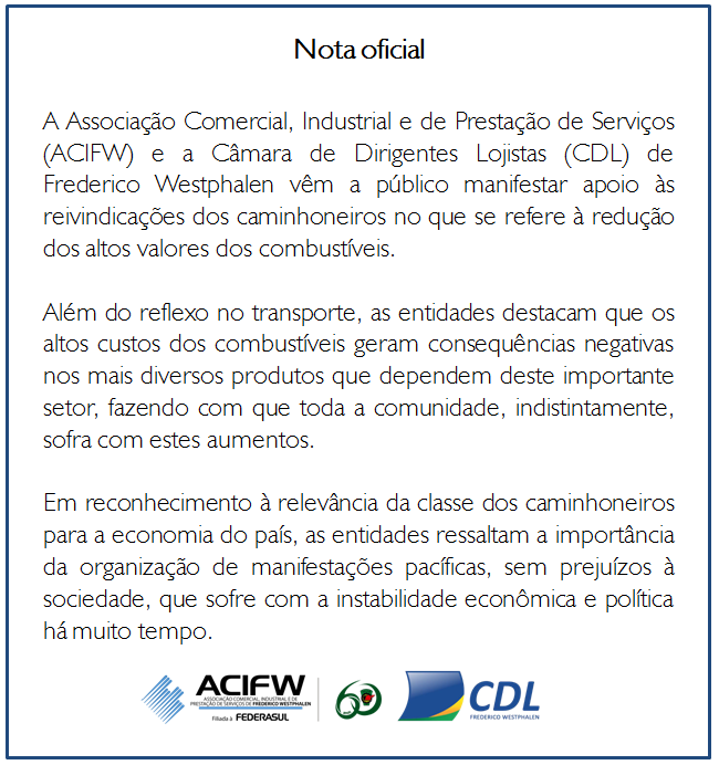 A Associação Comercial, Industrial e de Prestação de Serviços de Frederico Westphalen (ACIFW) divulgou na tarde desta terça-feira, 24, uma nota oficial e um comunicado , juntamente com a CDLFW e o Sindilojas, referentes à paralisação dos caminhoneiros. Confira: