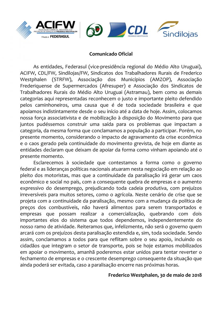 Na tarde desta quarta-feira, 30, entidades filiadas à Federasul, representantes de sindicatos, associações, empresários e demais lideranças participaram da coletiva de imprensa organizada na sede da ACIFW para o anúncio sobre o posicionamento frente ao movimento de greve dos caminhoneiros.Com a exposição de dados econômicos e relatos sobre a atual situação da greve, as lideranças chegaram a um consenso quanto ao posicionamento frente ao movimento de greve com uma nota oficial à imprensa: