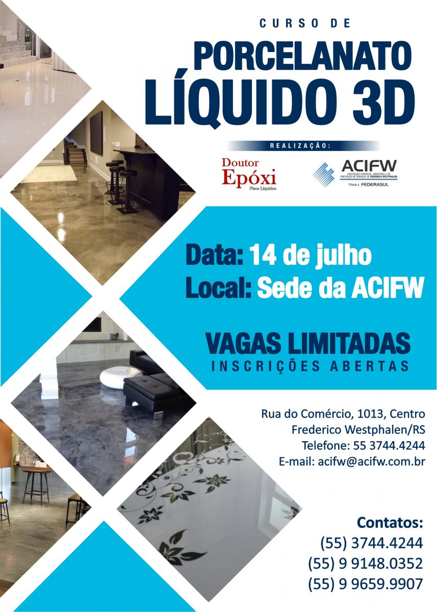 Porcelanato Líquido é o nome popular atribuído ao piso epóxi, que começou a ser utilizado em indústrias, laboratórios e hospitais e que está ganhando o gosto dos profissionais da construção civil, tanto para o uso em áreas comerciais, quanto em residenciais. Com a intenção de qualificar profissionais, a ACIFW promoverá um curso inédito na região, em parceria com a empresa Doutor Epóxi, no próximo sábado, 14, durante todo o dia, na sede da Associação. Para consultar os valores e garantir as últimas vagas, os interessados devem realizar a matrícula pelo telefone (55)3744-4244 ou (55) 9 9148-0352.