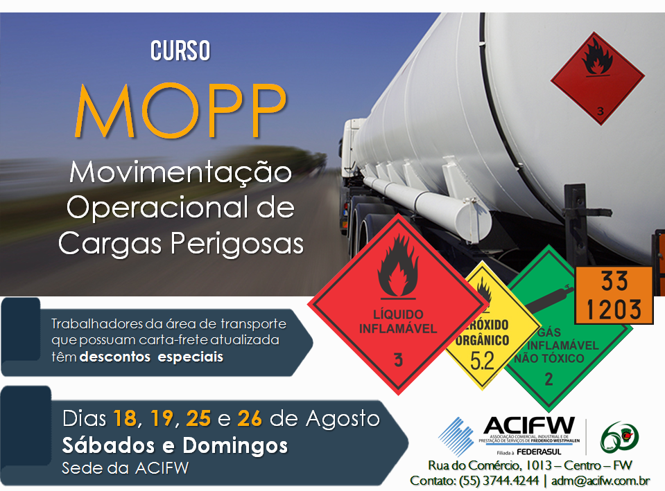 A Associação Comercial, Industrial e de Prestação de Serviços de Frederico Westphalen (ACIFW) promoverá o curso Movimentação Operacional de Produtos Perigosos na sede da entidade. A capacitação inicia neste sábado, 11 e será realizado durante quatro encontros, nos dias 18, 19, 25 e 26, aos sábados e domingos.