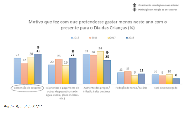 Dos que disseram que irão comprar presentes, mas que pretendem gastar menos ou o mesmo valor do ano passado, 31% afirmaram que o motivo é a contenção de despesas. O segundo motivo, que passou de 19% para 27% de 2017 para 2018, é a necessidade de priorizar o pagamento de outras contas da casa, como as de água, energia elétrica, mensalidade escolar etc. 25% afirmaram que o motivo é o aumento dos preços (inflação e alta dos juros). 11% redução da renda/salário e 6% porque estão desempregados.