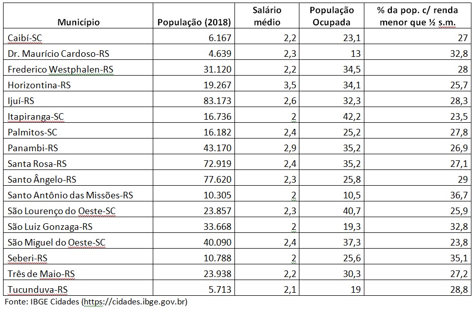 A massa salarial do município dividida pelo número de trabalhadores formais gera o salário médio e neste quesito destacam-se Horizontina e Panambi (RS). Por outro lado, na fatia da população que vive com menos de ½ mínimo destaca-se positivamente Itapiranga e São Miguel do Oeste (SC).