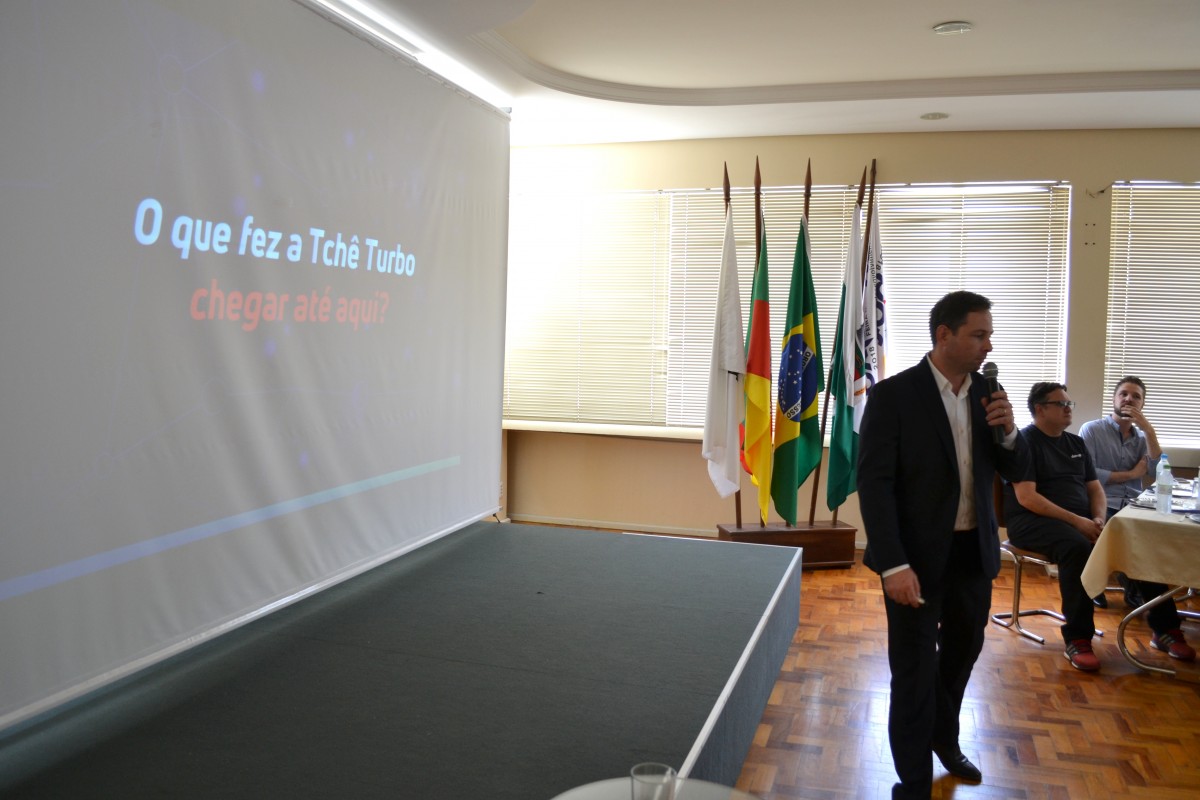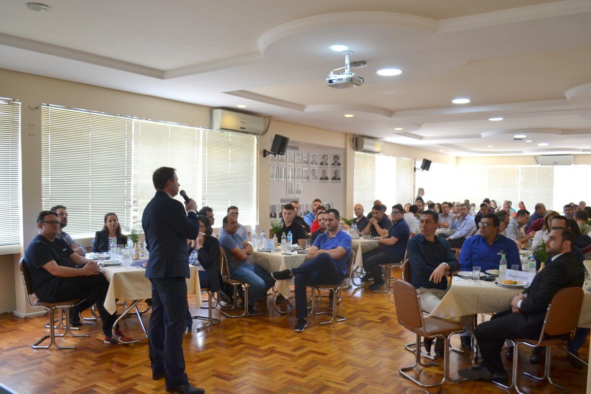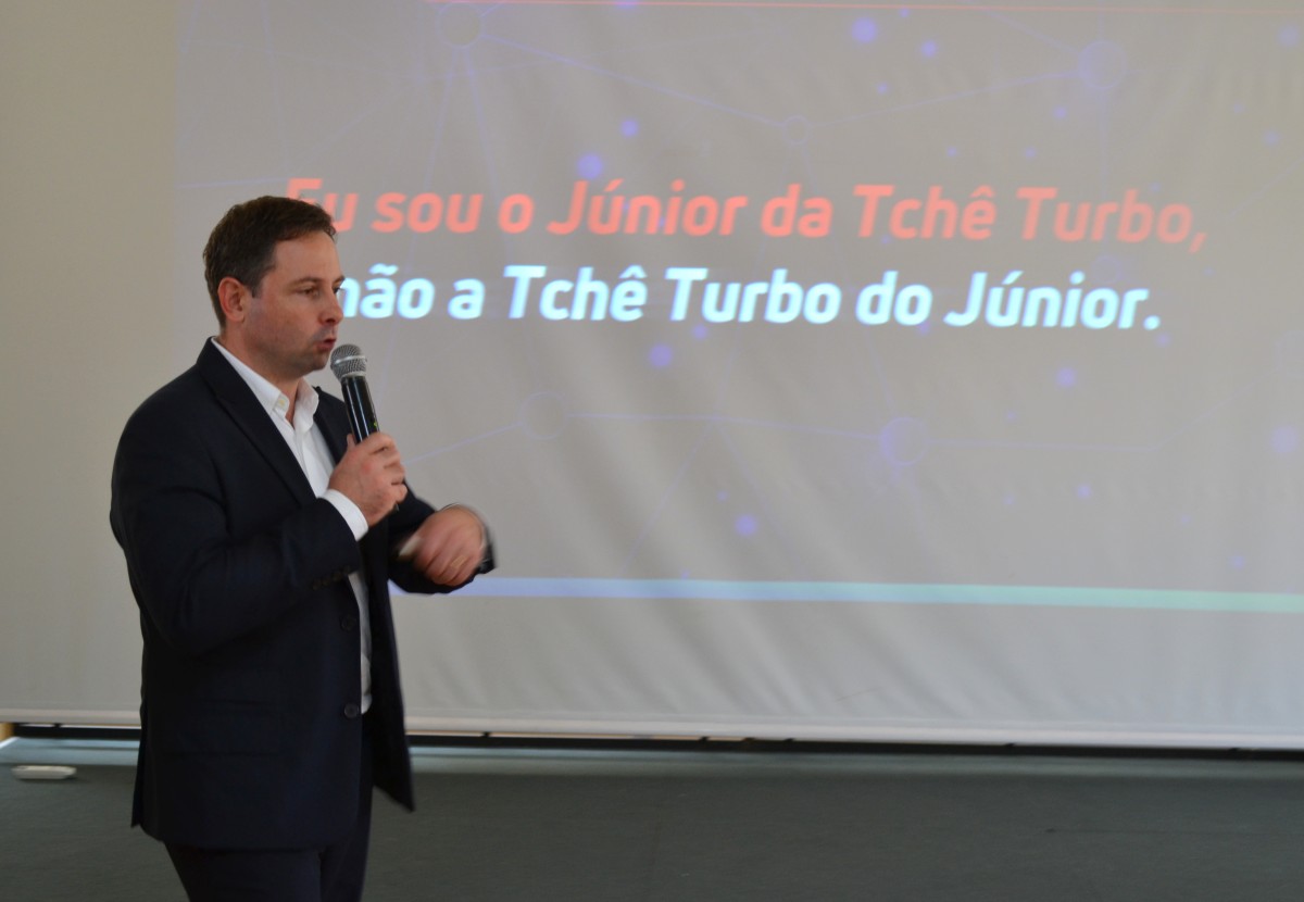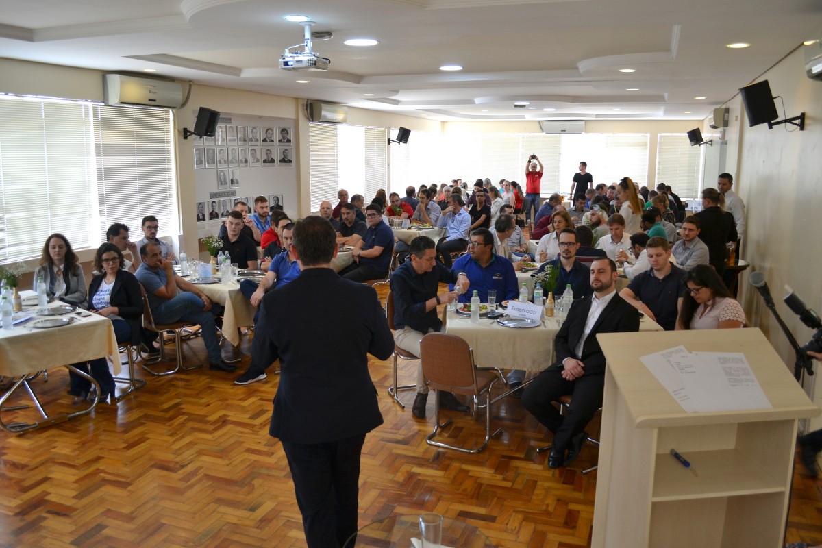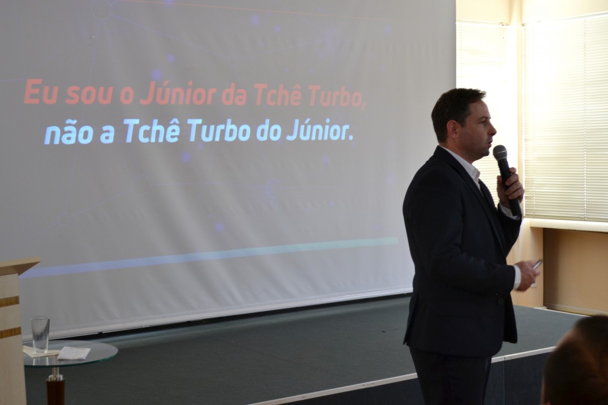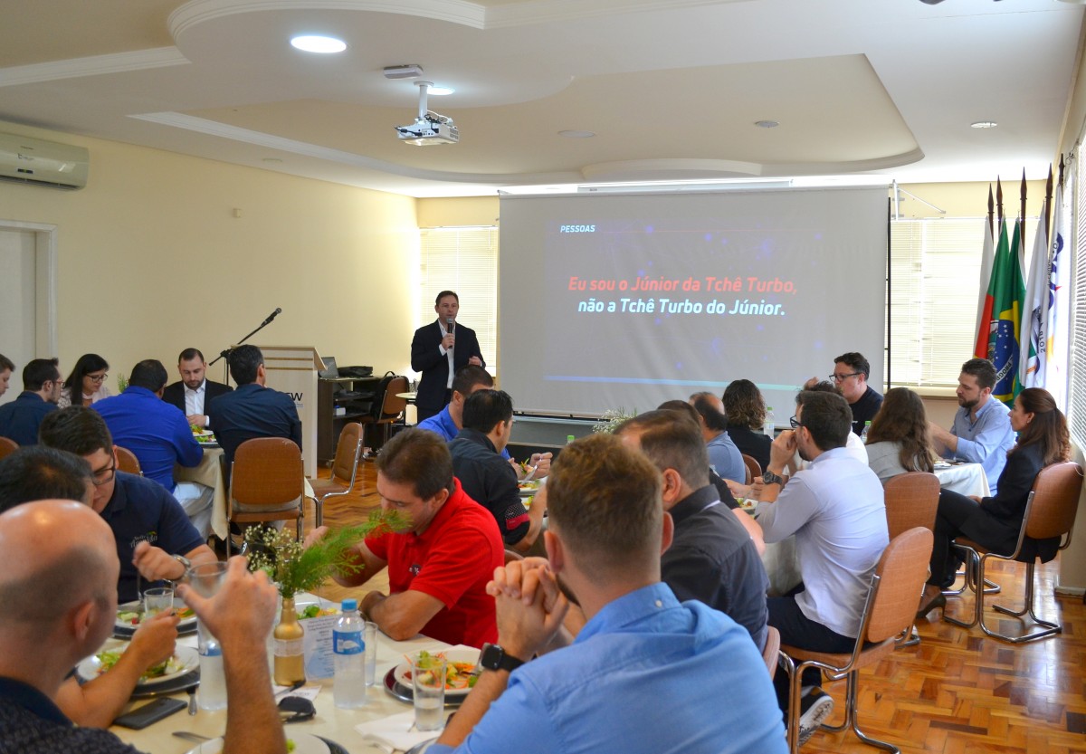 “O que fez a Tchê Turbo chegar até aqui?” Foi com esta pergunta que o Empresário do Ano 2018, Luiz Bastian Júnior iniciou a sua fala na primeira edição do “No tom da conversa”, que aconteceu ao meio dia desta quarta-feira, 24. O novo formato de evento acontecerá todas as últimas quartas-feiras de cada mês e trará empresários e lideranças para debaterem temas interessantes para a classe. Cerca de 90 pessoas, entre empresários, associados, amigos e parceiros prestigiaram o evento, onde Júnior compartilhou a sua trajetória empresarial e sua experiência no tradicional encontro.