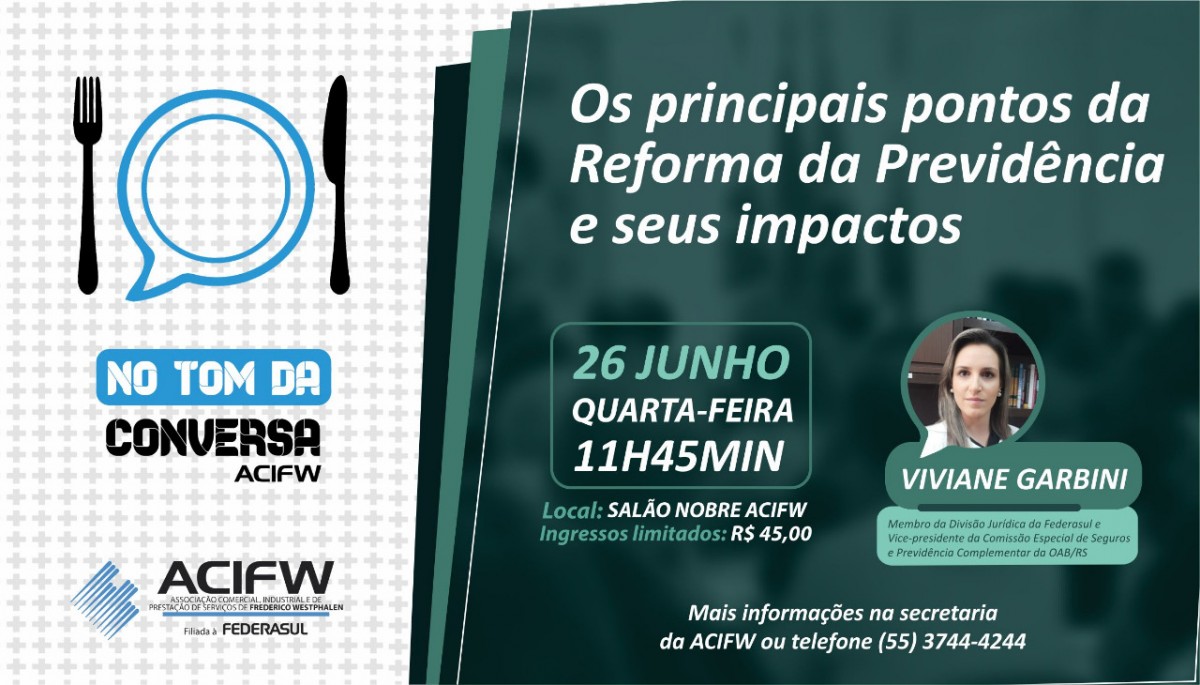 Na edição de junho do No Tom de Conversa, a Associação Comercial, Industrial e de Prestação de Serviço de Frederico Westphalen (ACIFW) escolheu a Reforma da Previdência como tema do encontro. O almoço acontecerá no dia 26 de junho, próxima quarta-feira, às 11h45, no salão nobre da entidade, com a presença da advogada Viviane Garbini.