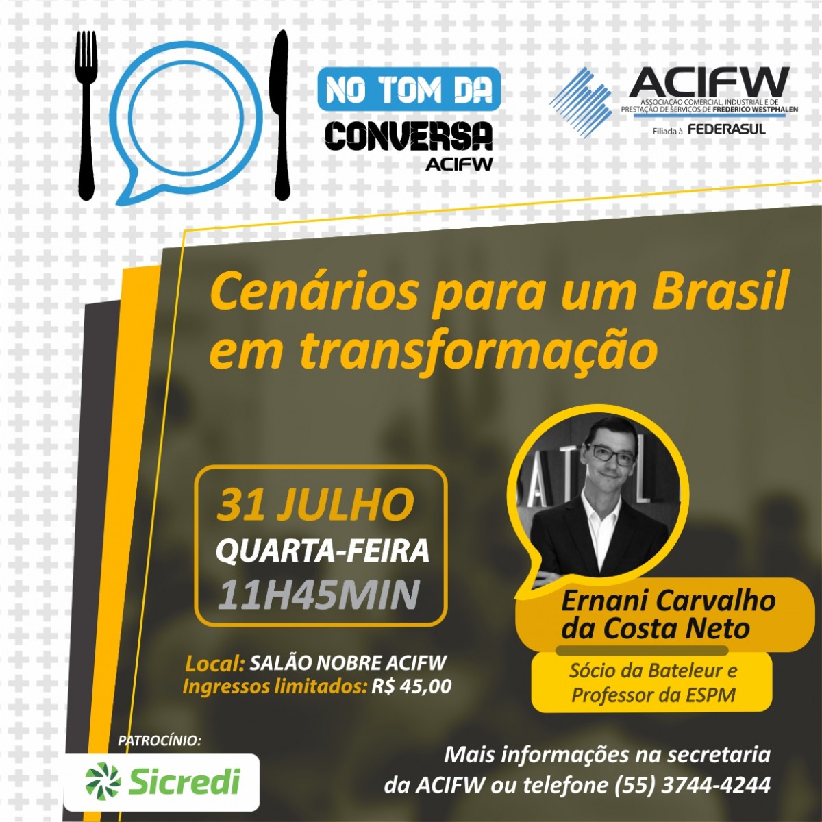 O almoço-palestra acontecerá no próximo dia 31 de julho, quarta-feira, às 11h45, no salão nobre da ACIFW. A palestra será realizada pelo sócio da Bateleur Assessoria Financeira e professor da ESPM, Ernani Carvalho da Costa Neto, que virá a Frederico Westphalen através do apoio da Federasul, e apresentará os principais acontecimentos internacionais e os desdobramentos econômicos no cenário brasileiro.