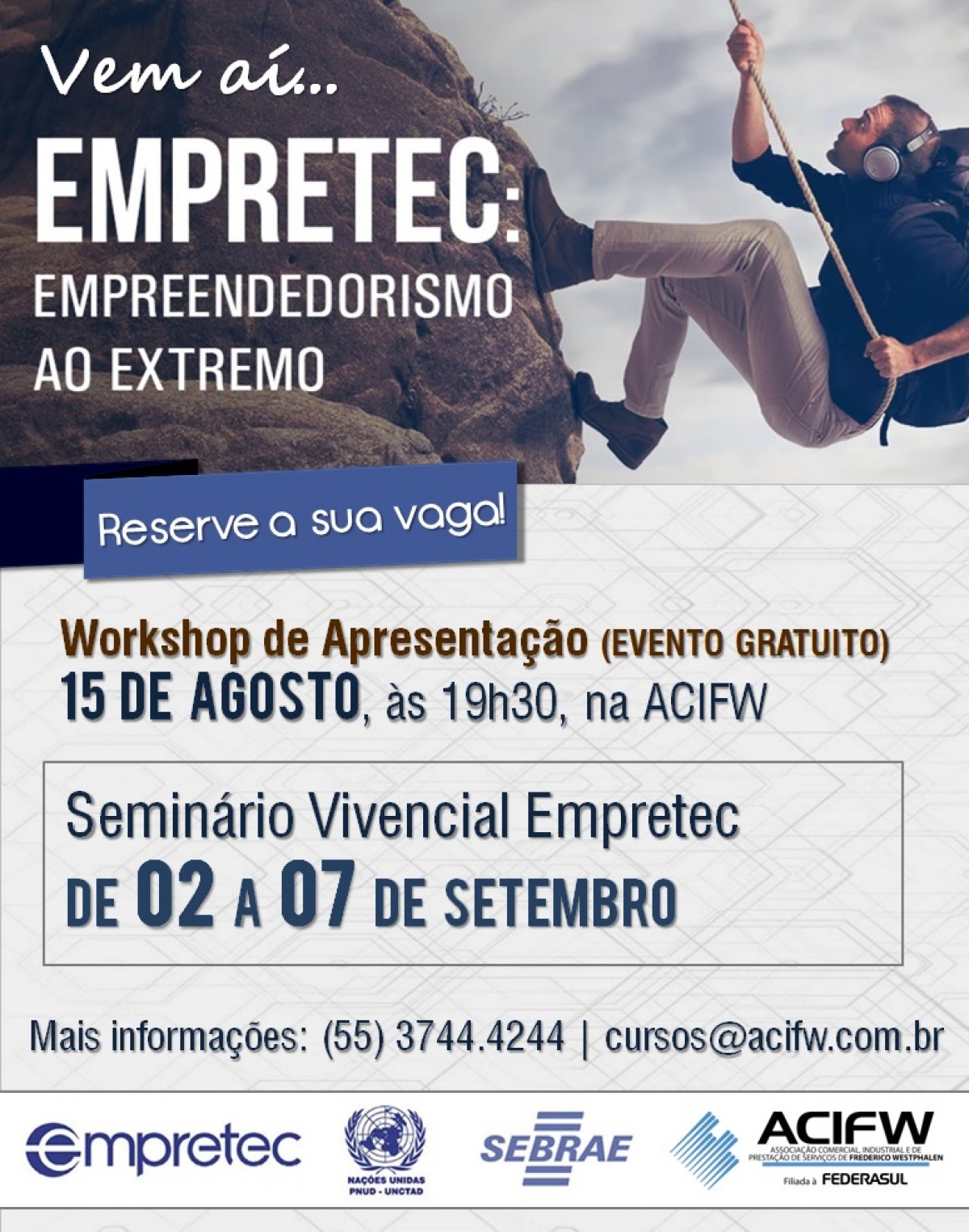 O Empretec é uma metodologia da Organização das Nações Unidas (ONU) voltada para o desenvolvimento de características de comportamento empreendedor e será realizado entre os dias 02 e 07 de setembro, em Frederico Westphalen. No Empretec, profissionais de todas as áreas, sejam empresários, estudantes ou funcionários, podem desenvolver habilidades pessoais e profissionais fundamentais para o mercado de trabalho atual. A ACIFW promoverá um workshop gratuito sobre o Empretec nesta quinta-feira, 15, às 19h30, no salão nobre da ACIFW. O evento é gratuito e para participar os interessados devem reservar vaga junto à secretaria da Associação, através do telefone (55) 3744.4244, redes sociais ou via e-mail cursos@acifw.com.br.