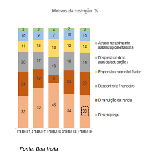 Dentre os motivos que levaram à inadimplência, 33% dos consumidores alegaram na pesquisa da Boa Vista que o principal motivo foi o desemprego. Em segundo lugar, com 23% das menções, a diminuição da renda e a consequente impossibilidade de honrar todos os compromissos financeiros. Em terceiro lugar o descontrole financeiro (19%) e, em quarto lugar, o empréstimo do nome (12%). Logo em seguida foram citados como causa da inadimplência, despesas extras com saúde e educação (10%) e o atraso no recebimento de salário (3%). A imagem a seguir tem os detalhes: