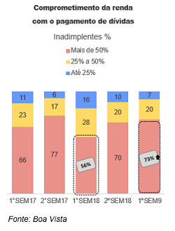 Saltou de 56% para 73%, na comparação entre o 1º semestre de 2018 com o 1º semestre de 2019, o percentual de consumidores inadimplentes que estão com mais de 50% da renda comprometida com o pagamento de dívidas (vencidas ou não), segundo Pesquisa Perfil do Consumidor Inadimplente, da Boa Vista, com abrangência nacional, realizada nos seis primeiros meses deste ano.