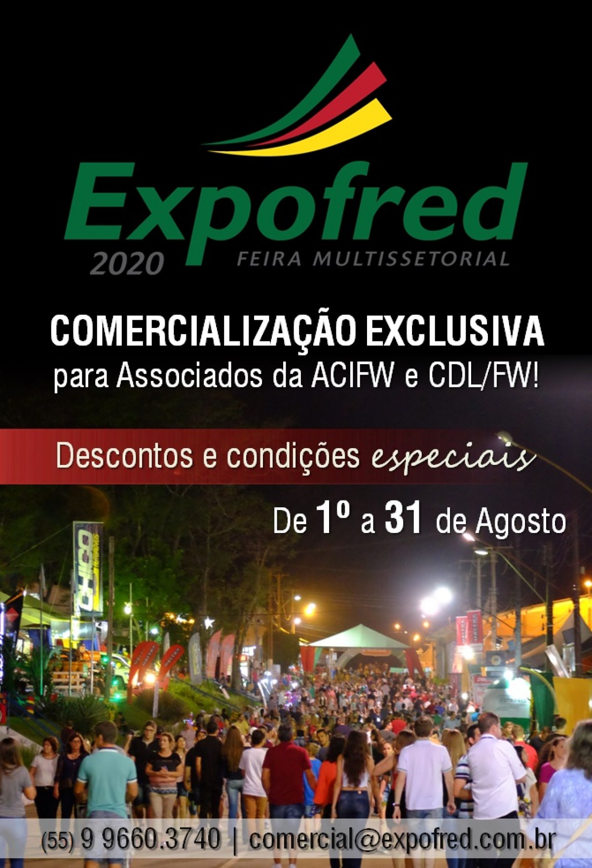 Os associados da ACIFW e CDL/FW podem garantir o seu espaço para a Expofred 2020 de modo exclusivo durante todo o mês de agosto. Fortalecendo a missão de desenvolver a economia local e regional, através da mostra de potencialidades e da geração de negócios, a Comissão Organizadora da feira destina a primeira etapa de comercialização dos estandes aos associados da ACIFW e CDL/FW. As empresas locais têm prioridade na escolha dos espaços, bem como descontos e condições especiais de pagamento. A venda exclusiva iniciou no dia 1º e estende-se até o dia 31 de agosto.