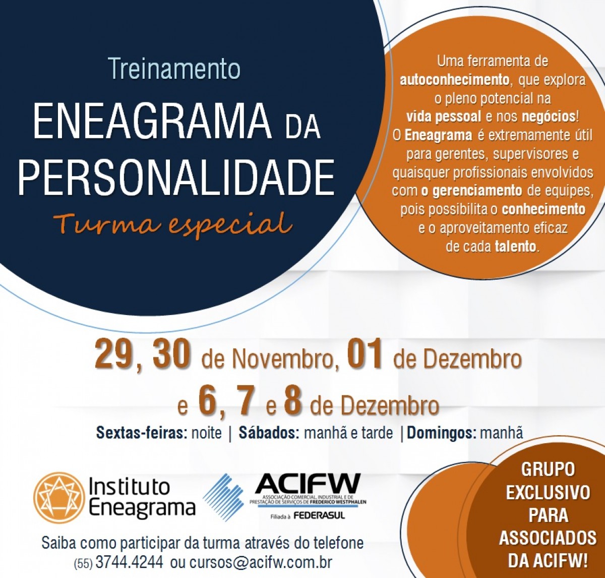 Associação Comercial, Industrial e de Prestação de Serviço de FW (ACIFW), em parceria com o Instituto Eneagrama, promoverá um treinamento especial, voltado aos associados da entidade. A turma exclusiva será formada em dois finais de semana, diferente da modalidade usual de três meses, nos dias 29, 30/11 e 01/12 e 06, 07 e 08/12. O treinamento acontecerá na sede da ACIFW nas sextas-feiras a noite, sábado pela manhã e tarde e domingo de manhã. As vagas são limitadas e os interessados podem obter mais informações diretamente na ACIFW, pelo telefone (55) 3744.4244 ou via e-mail cursos@acifw.com.br.