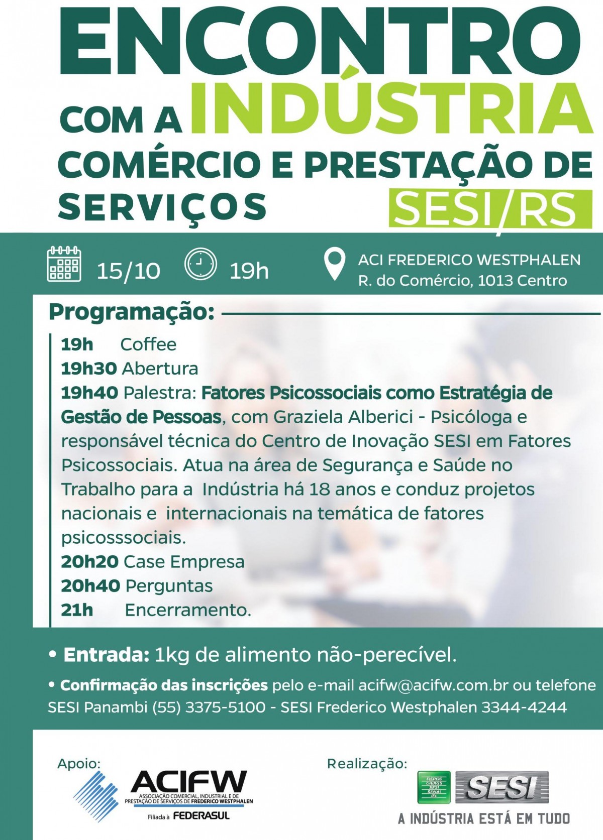 A palestra será ministrada pela psicóloga e responsável técnica do Centro de Inovação SESI em Fatores Psicossociais, Graziela Alberici, que atua na área de Segurança e Saúde no Trabalho para a Indústria há 18 anos e conduz projetos nacionais e internacionais na temática de fatores psicossociais. A entrada para o evento é 1kg de alimento e os interessados devem reservar vaga junto à ACIFW, diretamente no escritório (Rua do Comércio, 1013), pelo e-mail cursos@acifw.com.br ou pelo telefone (55) 3744.4244.