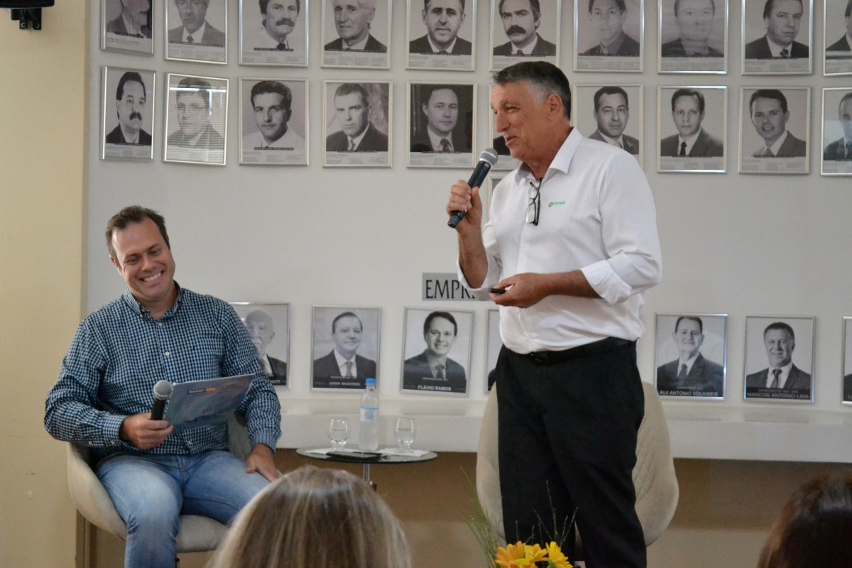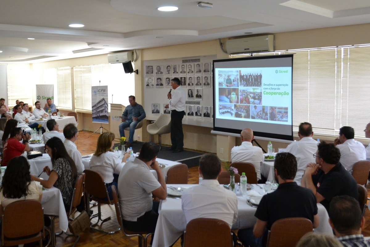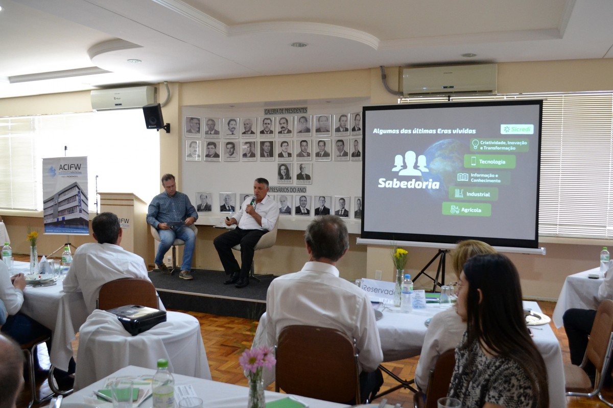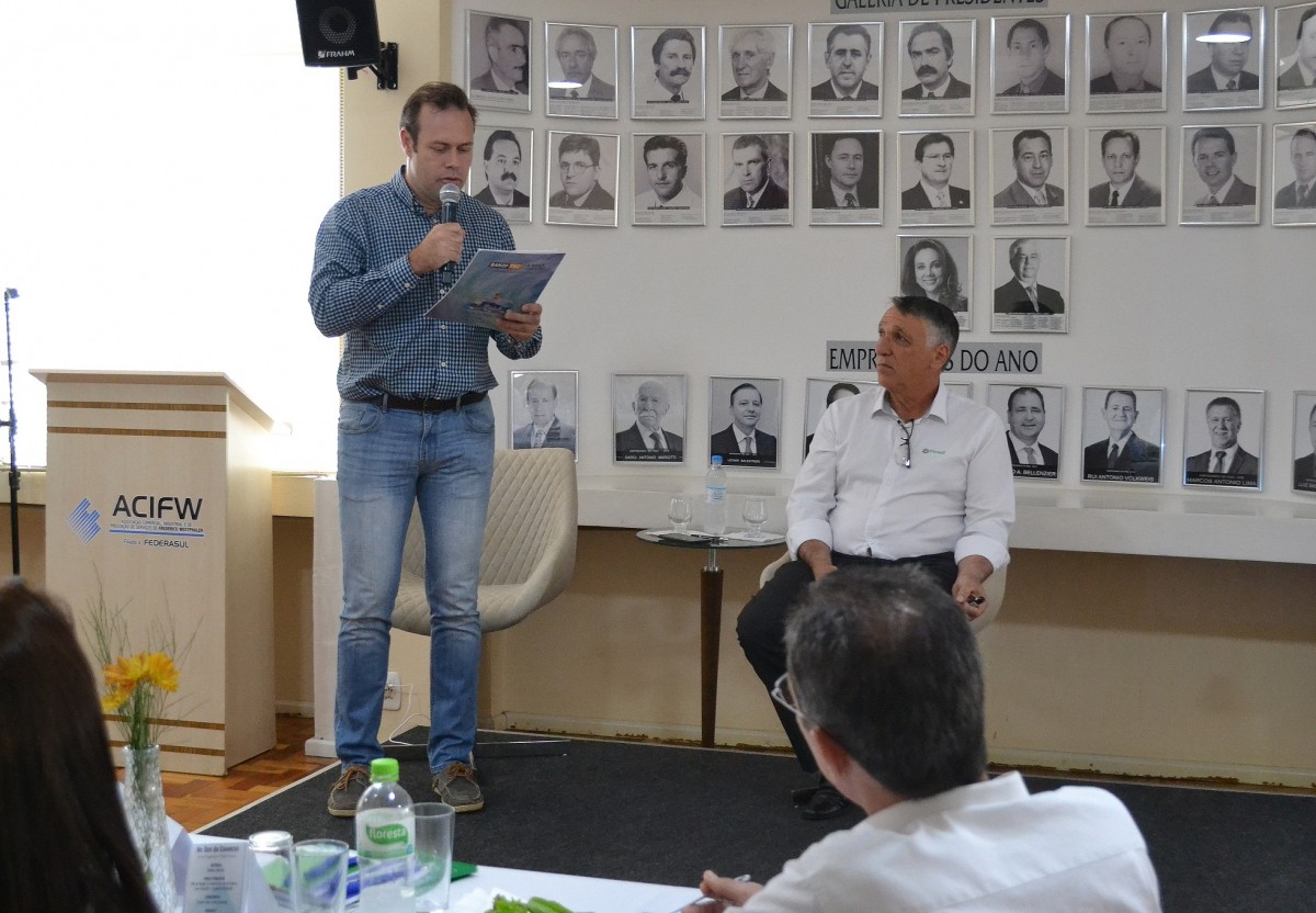 Com a mediação do diretor de indústria da ACIFW, Alex Knapp Bakof, o presidente da instituição financeira compartilhou a sua experiência de gestão e os principais resultados obtidos nos últimos anos. Na primeira parte de sua apresentação, Eugenio trouxe a construção do planejamento a longo prazo da Sicredi, lançado em 2016 na comemoração dos 35 anos da instituição, destacando os principais desafios e resultados. Na sequência, comentou sobre o plano de sucessão desenvolvido, processo que é enfrentado em grande parte das empresas do município, devido à constituição familiar dos negócios. “Resolvemos mostrar um pouco de como foi o plano de sucessão, porque o consideramos fácil, graças a discussão ampla, realizada de forma tranquila, democrática e transparente. O relacionamento torna-se sólido quando a cooperação está intrínseca nas ações”, destaca Poltronieri.