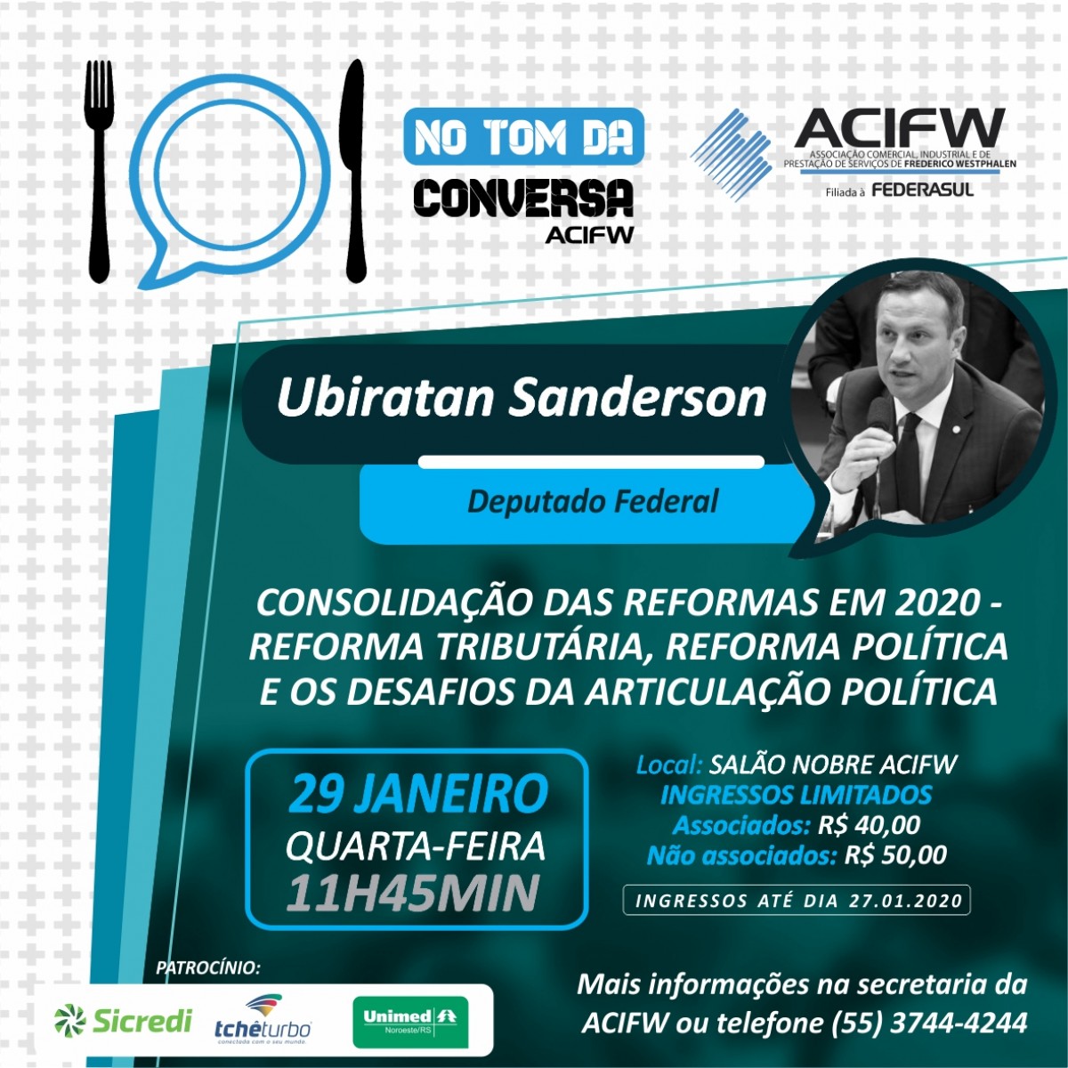 A primeira edição do almoço-palestra No Tom da Conversa já tem data marcada: dia 29 de janeiro, quarta-feira. A Associação Comercial, Industrial e de Prestação de Serviço de Frederico Westphalen (ACIFW) receberá o Deputado Federal Ubiratan Sanderson que irá palestrar sobre a consolidação das reformas em 2020. No evento, que será realizado às 11h45 no salão nobre da ACIFW, o deputado irá abordar alguns pontos como a Reforma Tributária, Reforma Política e os desafios da articulação política. O evento tem o patrocínio da Tchê Turbo Telecom, Sicredi Alto Uruguai RS/SC/MG e Unimed Noroeste /RS. Os ingressos são limitados e podem ser adquiridos na secretaria da entidade no valor de R$40,00 para associados e R$50,00 para não associados.