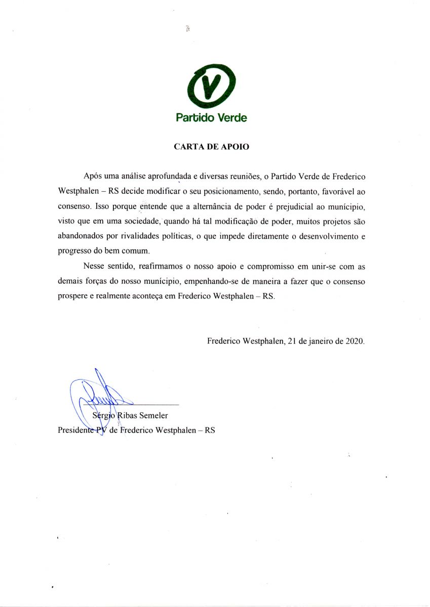 Nesta terça-feira, 21, a Associação recebeu uma nova manifestação do Partido Verde (PV), agora favorável ao consenso. A carta, que foi divulgada na íntegra, reafirma o compromisso do partido em unir-se com as demais forças do município e declara que “quando há tal modificação de poder, muitos projetos são abandonados por rivalidades políticas, o que impede diretamente o desenvolvimento e progresso do bem comum”.