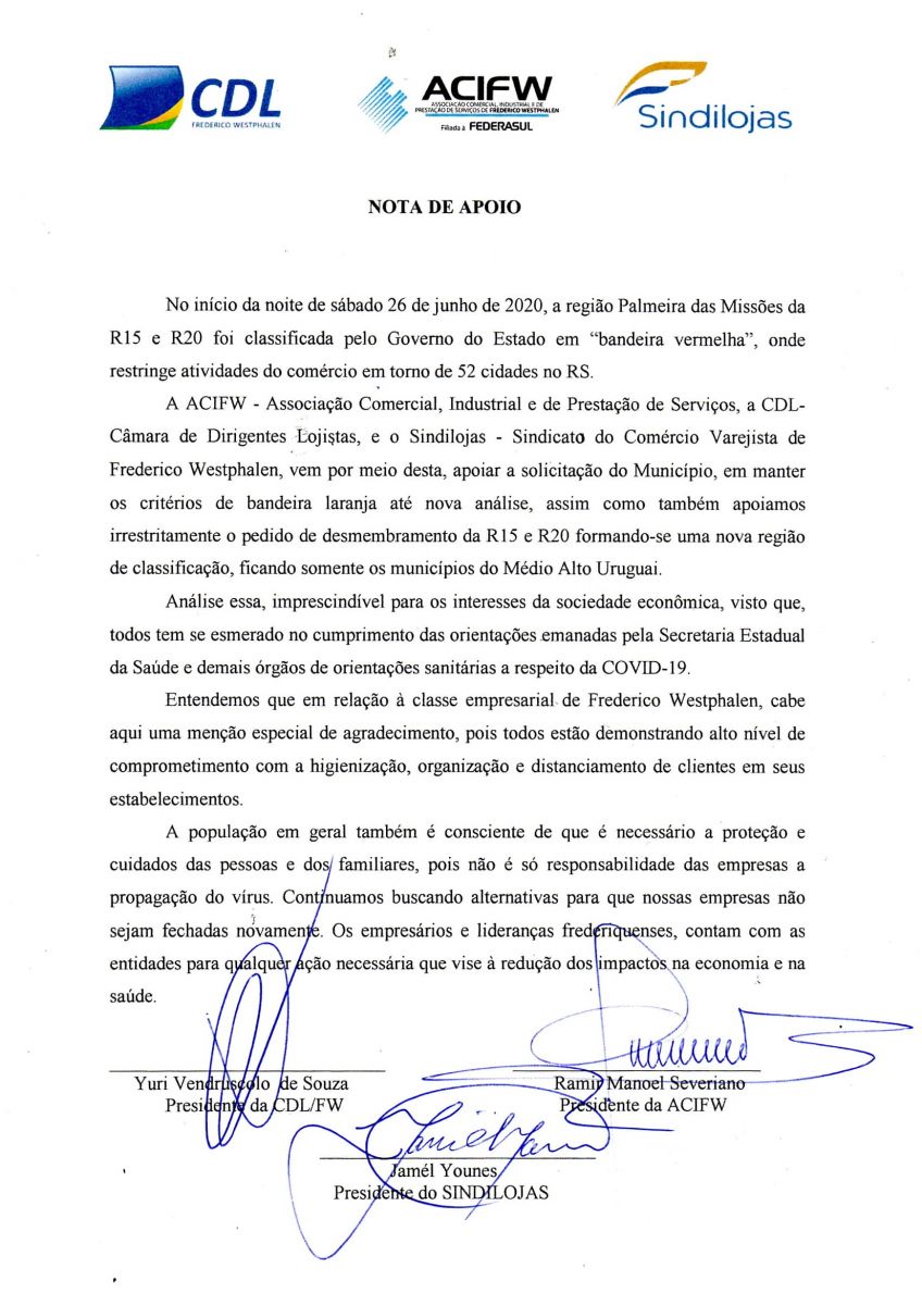 Entidades empresariais do município declararam apoio à Administração Municipal que pede ao governo do RS a manutenção dos critérios de bandeira laranja e o desmembramento da região de classificação.