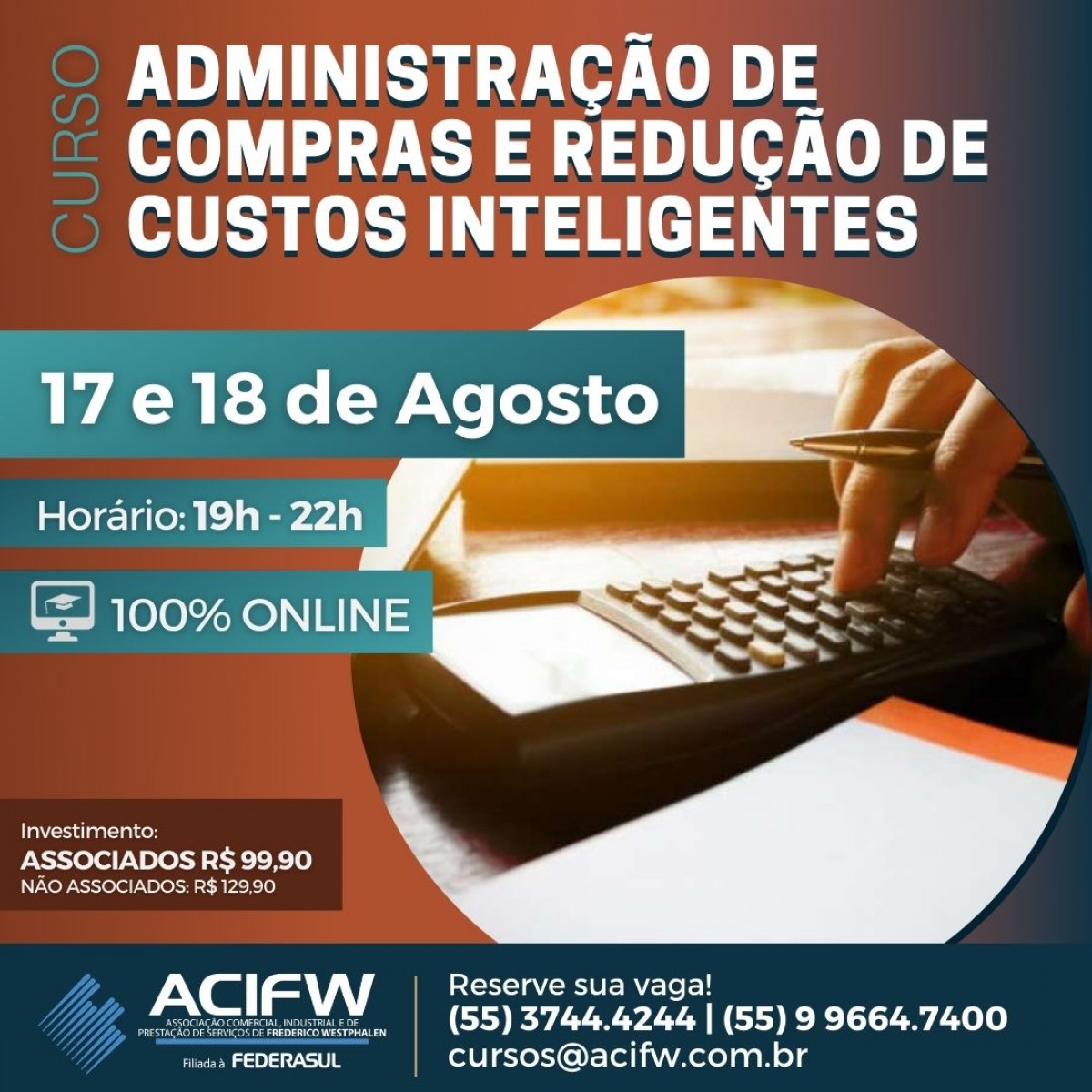 Nos dias 17 e 18, será realizado o curso “Administração de Compras e Redução de Custos Inteligentes”, das 19h às 22h, através de videoconferência. Já nos dias 25 e 27, acontece a capacitação “Gestão Financeira em tempos de reinvenção do modelo de negócio”, das 19h às 21h, também através de plataforma online. Para cada um dos cursos o investimento é de R$99,90 para associados da ACIFW ou R$129,90 para público geral, ambos com condições especiais de pagamento. Confira os conteúdos programáticos: