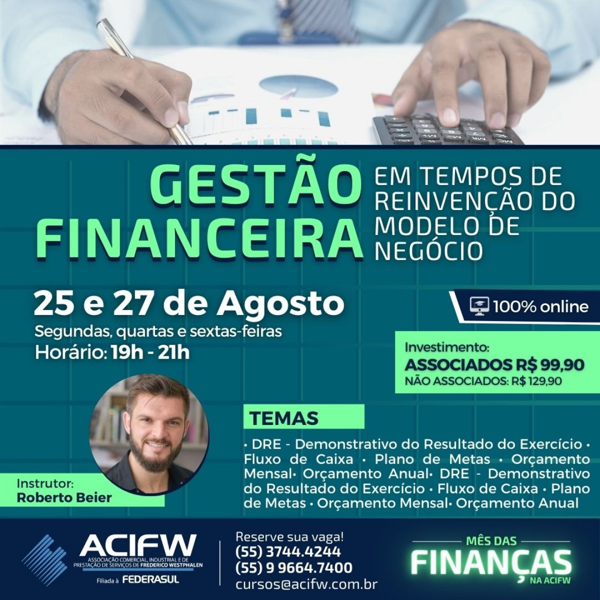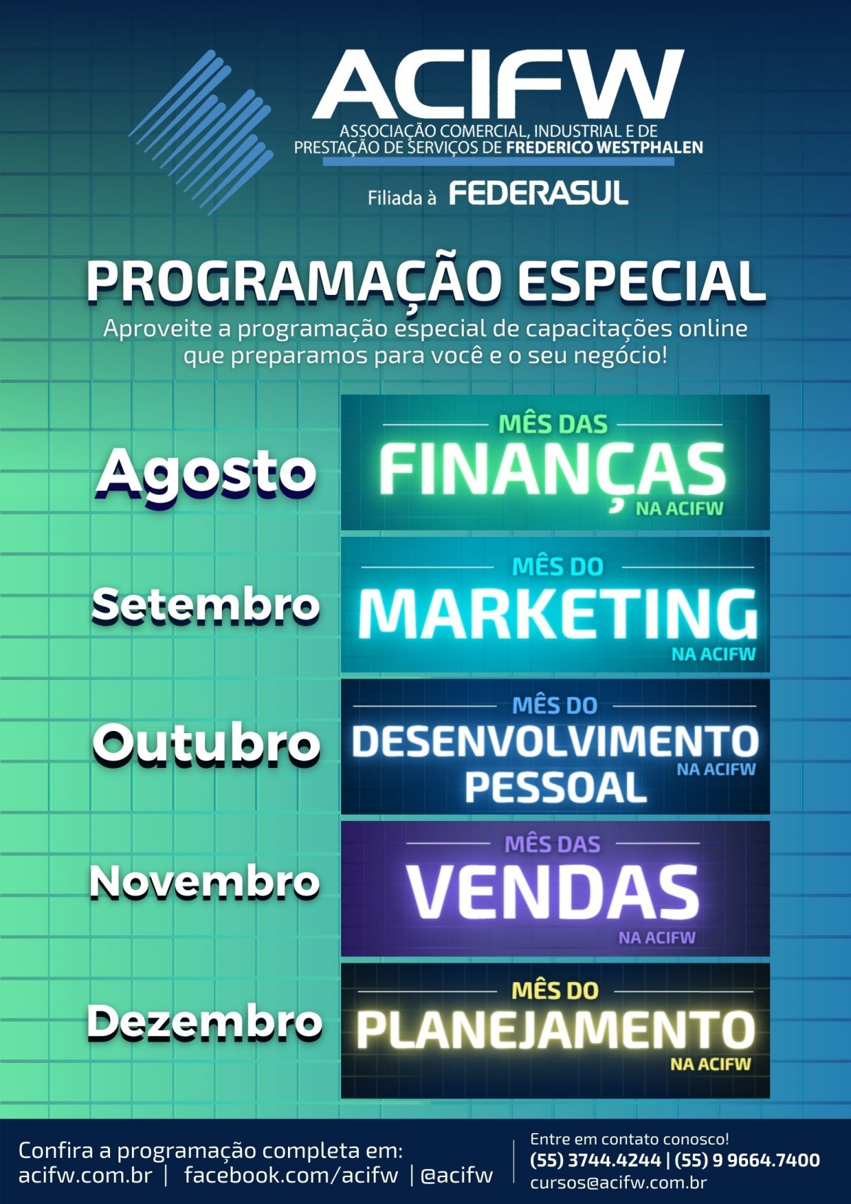 Em agosto, a ACIFW preparou o “Mês das Finanças”, com duas capacitações e uma live, realizada em parceria com a Sicredi. Confira a agenda divulgada pela entidade:
